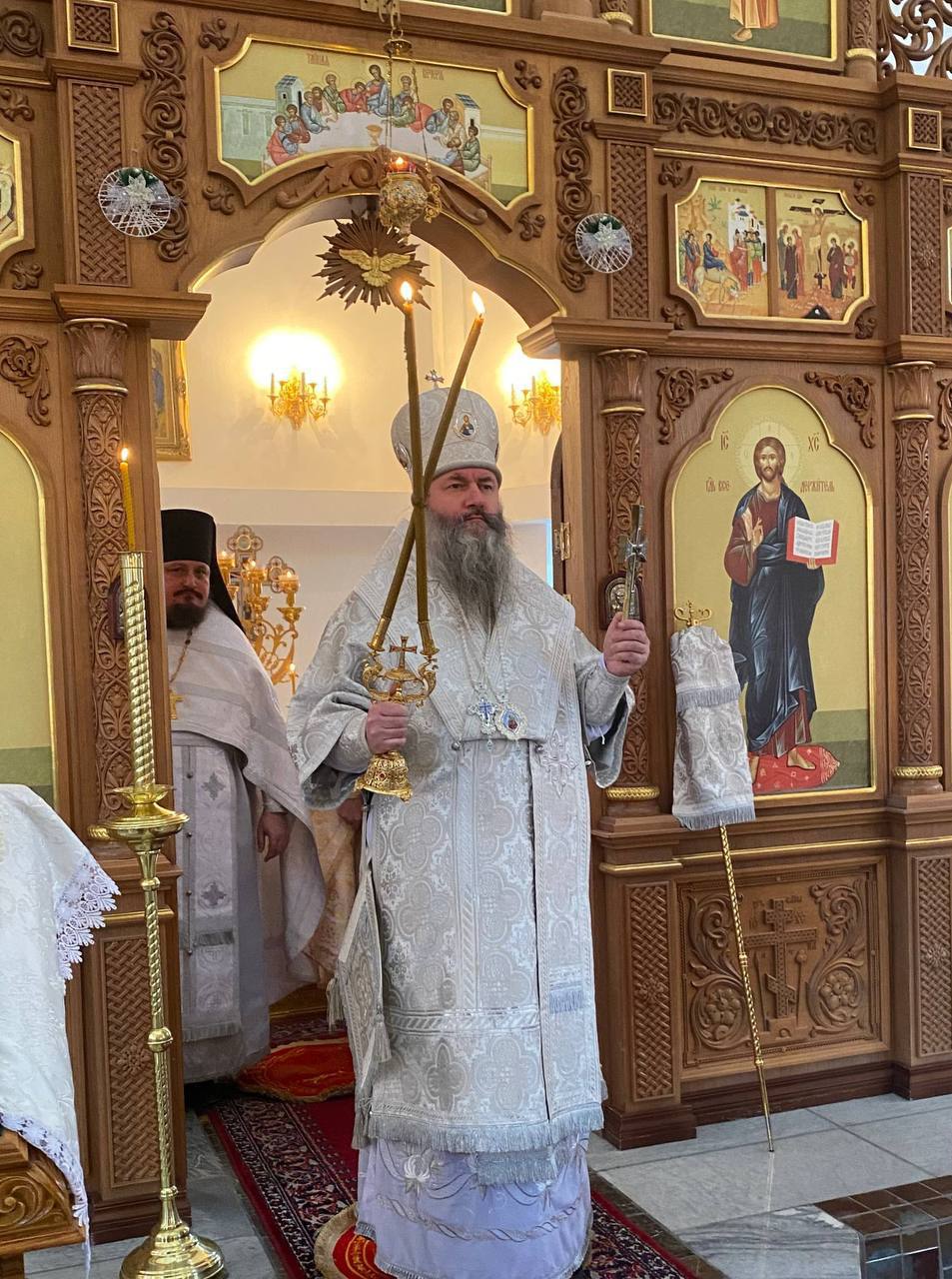 Его Высокопреосвященству сослужили секретарь епархиального управления иеромонах Гавриил (Горин), настоятель храма иеромонах Владимир (Мухин) и диакон Андрей Изатшоев.