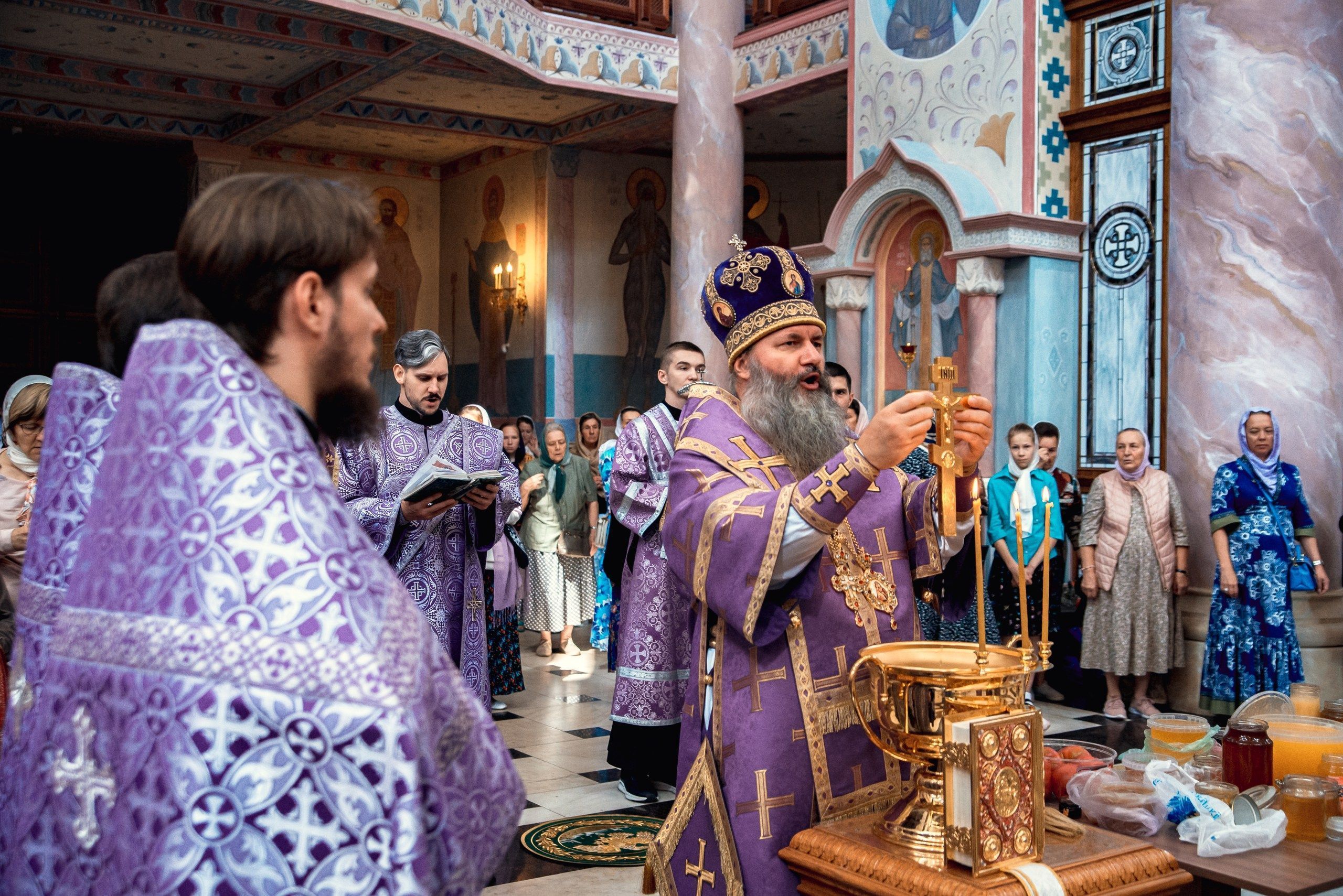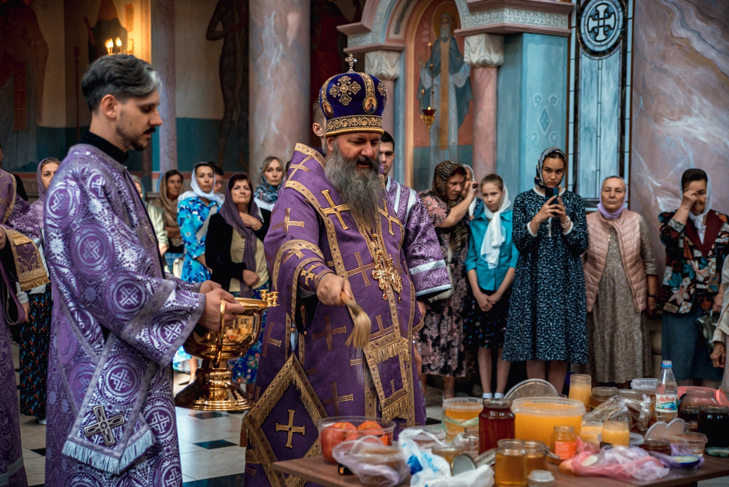 После окончания литургии согласно богослужебному уставу было совершено малое освящение воды. Также по традиции епископ Феодосий освятил мёд нового урожая.
