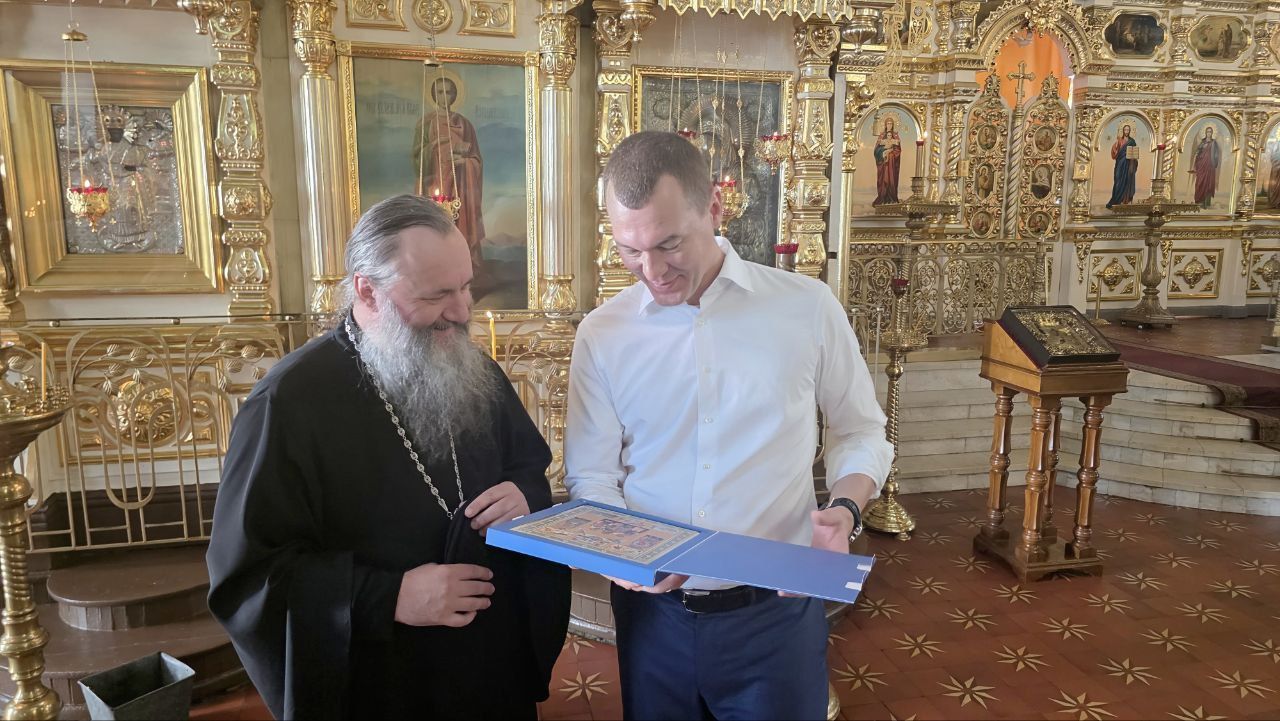 В завершение визита епископ Феодосий передал в дар Михаилу Владимировичу образ Божией Матери. В свою очередь министр спорта Российской Федерации подарил Владыке икону «Собор святых воинов, покровителей спорта».