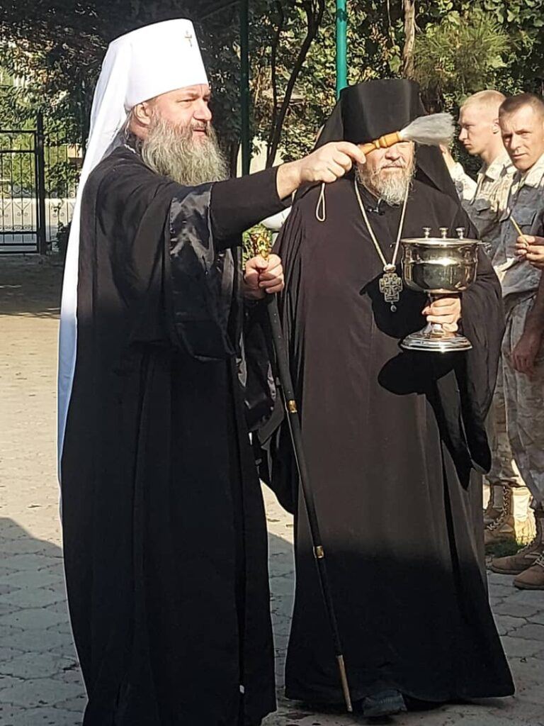 После богослужения Владыка пообщался с военнослужащими базы и окропил их святой водой.