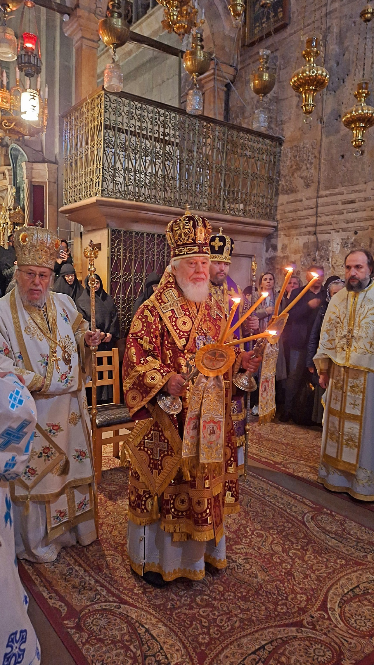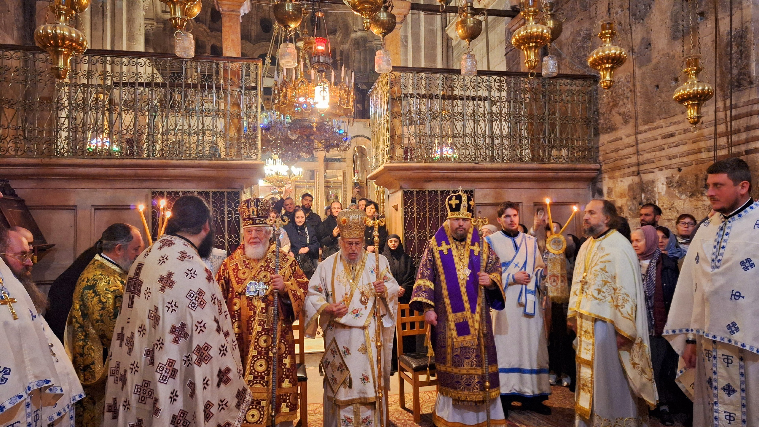 Песнопения утрени и Литургии исполнил братский хор Храма Гроба Господня. Богослужение было совершено на греческом, церковнославянском и арабском языках.