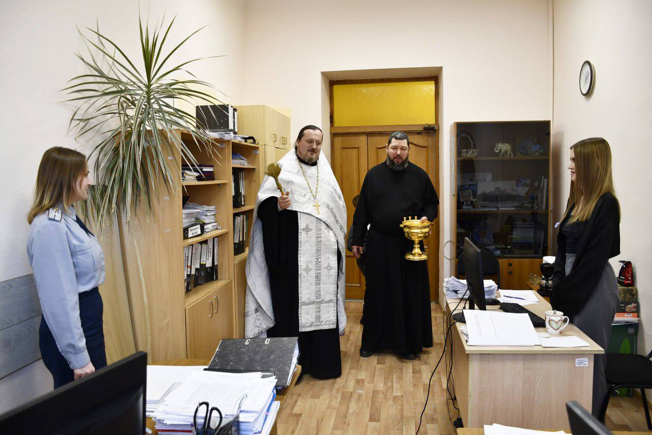 По освящении воды иерей Андрей Иванов окропил святой водой рабочие помещения ведомства.