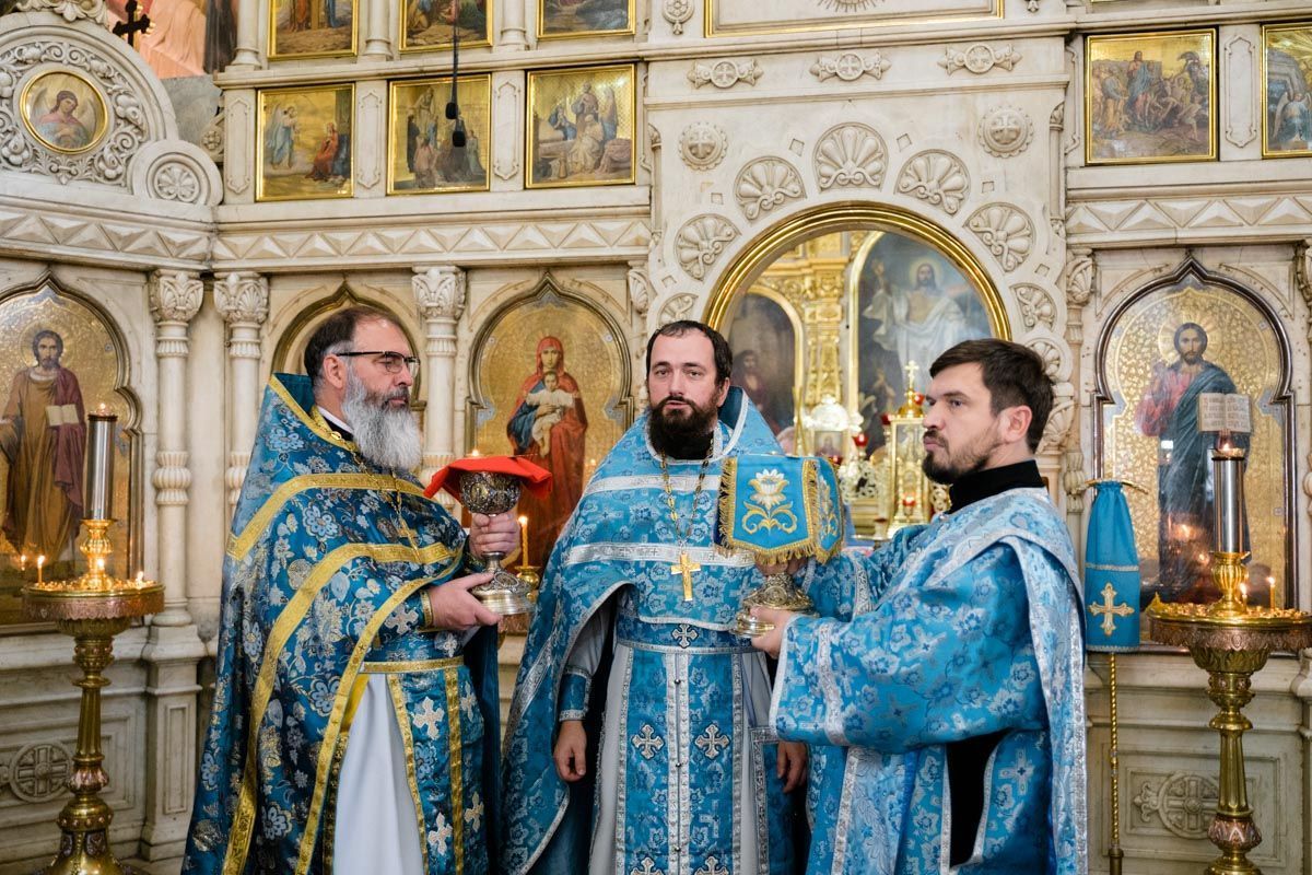 Его Высокопреосвященству сослужили: протоиерей Евгений Зеленцов, клирик Покровского кафедрального собора г. Самары; протоиерей Владимир Загаринский, благочинный Новокуйбышевского округа, настоятель кафедрального собора в честь иконы Божией Матери «Умиление» г. Новокуйбышевска; протоиерей Иоанн Мохов, благочинный Центрального округа, настоятель храма святителя Спиридона Тримифунтского г. Самары, руководитель отдела по вопросам физкультуры и спорта Самарской епархии; протоиерей Максим Кокарев, ректор Самарской духовной семинарии; протоиерей Сергий Пушкарев, благочинный Волжского округа, настоятель храма Рождества Пресвятой Богородицы пгт Петра Дубрава; иерей Димитрий Мартыненко, настоятель храма Пророка, Предтечи и Крестителя Господня Иоанна г. Самары; иерей Алексий Барсуков, настоятель храма Богоявления Господня в Волгаре г. Самары; духовенство Самарской епархии и клирики собора. На богослужении молился протоиерей Николай Одинаркин.