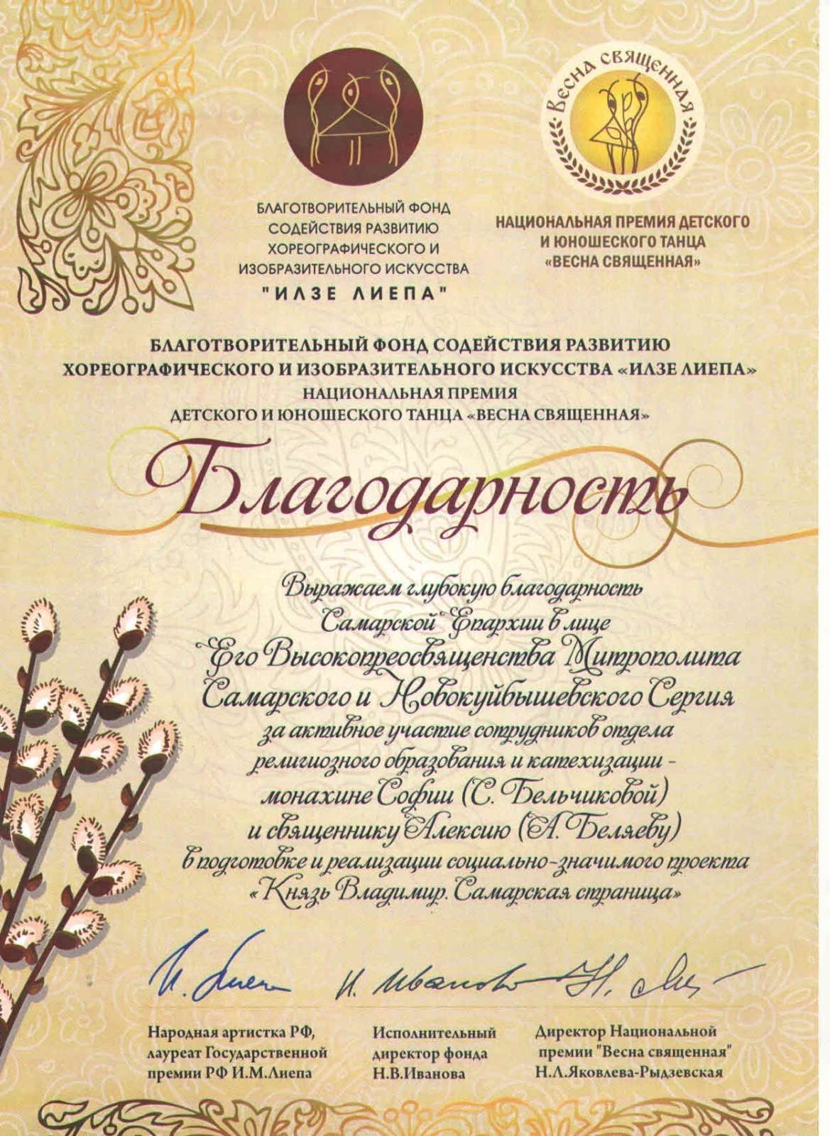 Благотворительный фонд "Илзе Лиепа" выражает благодарность Митрополиту Самарскому и Новокуйбышевскому Сергию за активное участие и реализации социально значимого проекта "Князь Владимир Самарская страница".