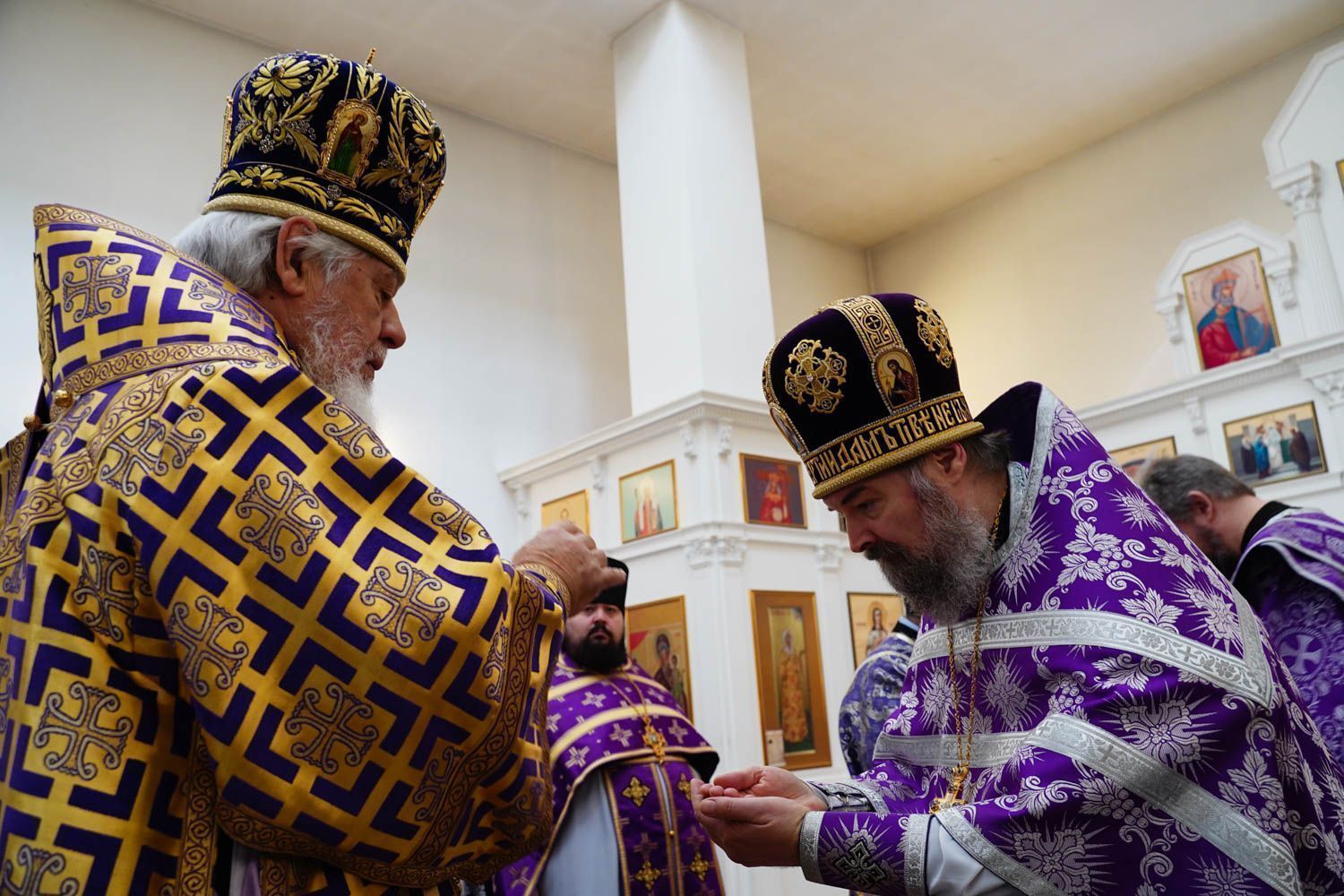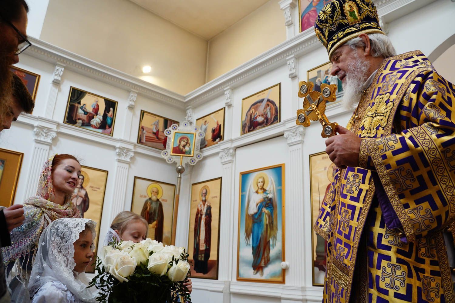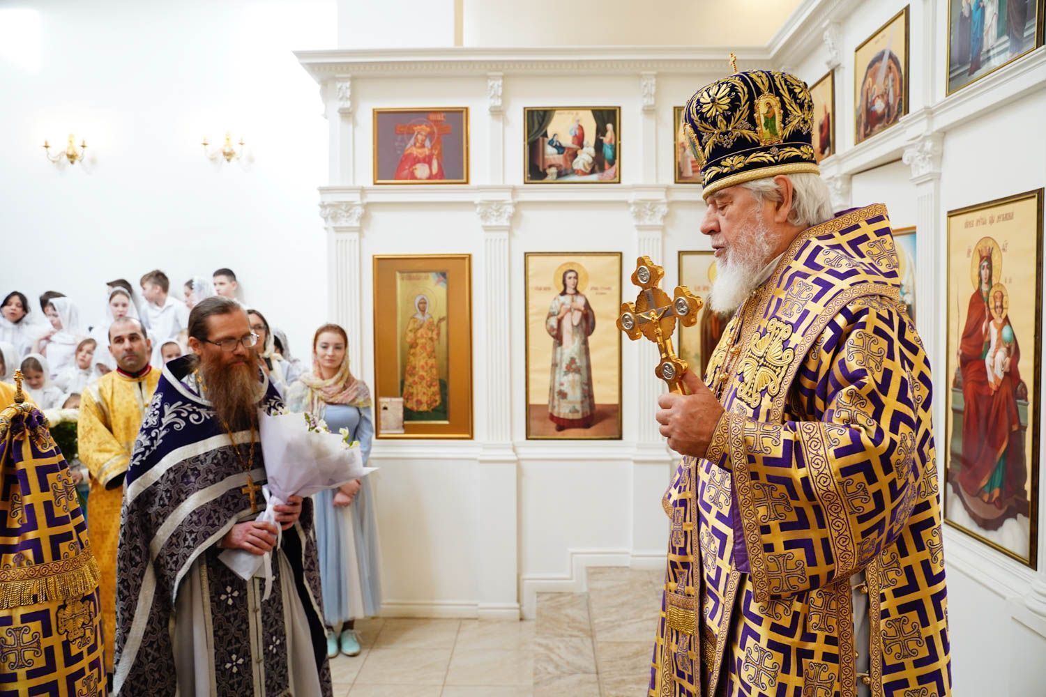 Настоятель храма иерей Григорий Краснов тепло приветствовал владыку Сергия и преподнес Его Высокопреосвященству букет цветов.