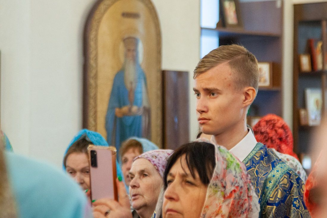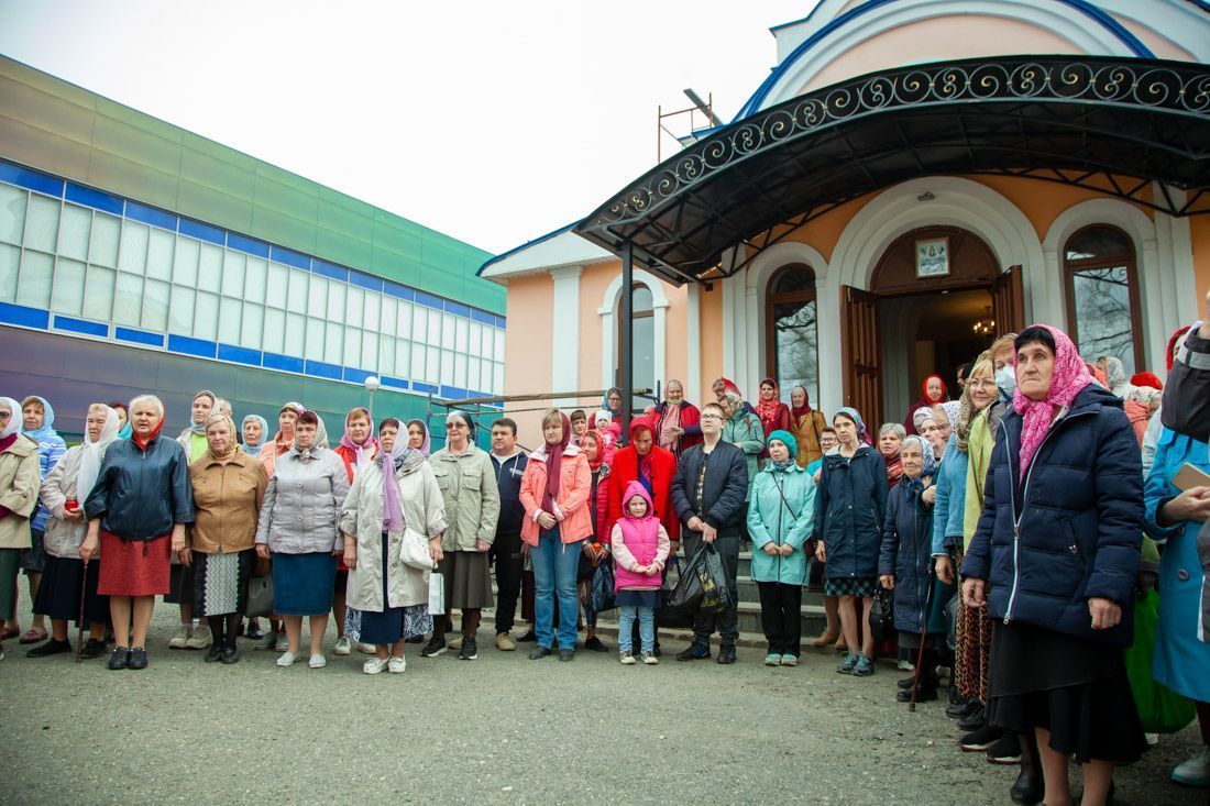По окончании Литургии владыка возглавил чин молебного пения с малым водоосвящением, после чего был совершен праздничный крестный ход вокруг храма.
