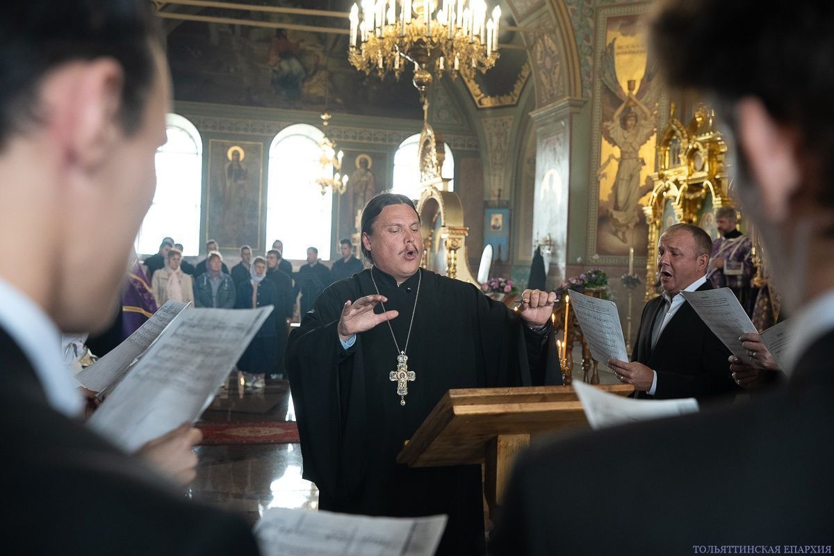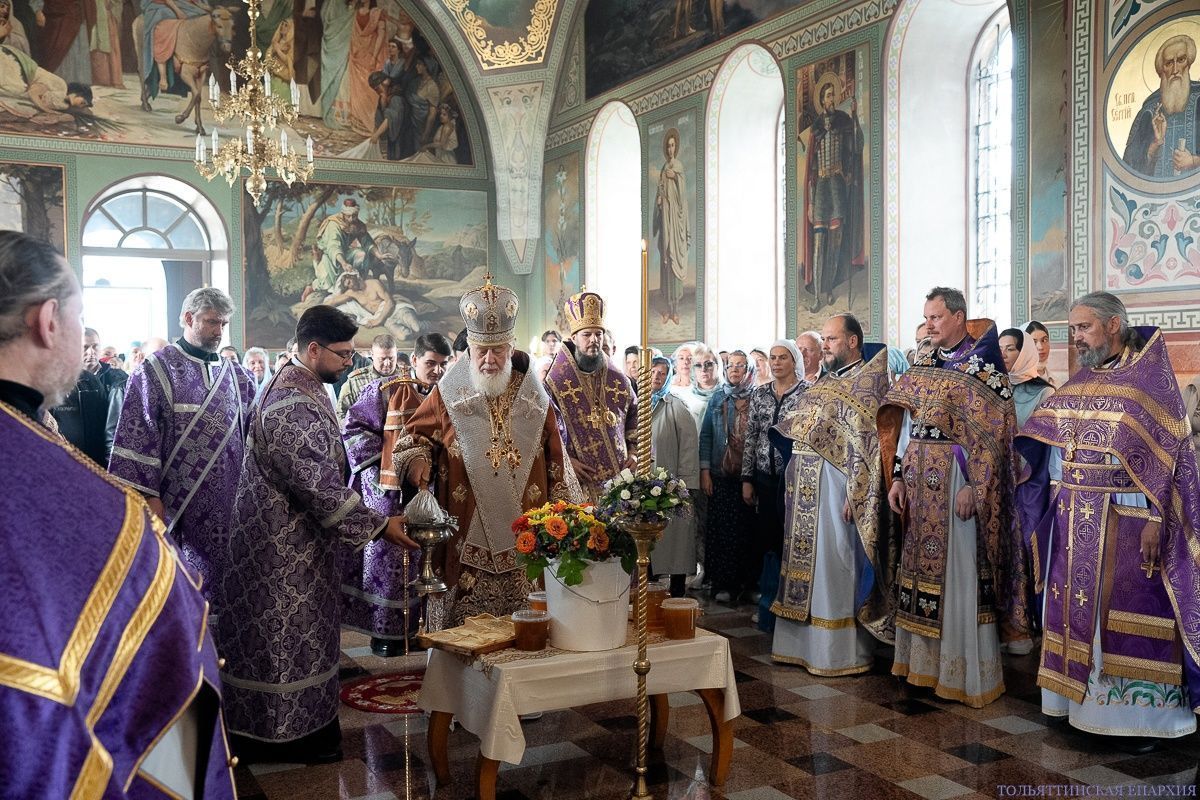 Архиереям сослужили священнослужители Самарской, Кинельской и Тольяттинской Епархий: клирик Георгиевского храма Самары архимандрит Вениамин (Лабутин), настоятель Казанского храма с. Новая Бинарадка протоиерей Андрей Ухаткин, секретарь Тольяттинского епархиального управления иерей Дионисий Бунцев, секретарь Самарского епархиального управления протоиерей Сергий Пушкарев, настоятель Георгиевского храма с. Георгиевка Кинельская района протоиерей Максим Клювиткин, настоятель храма во имя благоверной царицы Тамары Тольятти протоиерей Сергий Паруков, настоятель Владимирского храма г. Жигулёвск протоиерей Сергий Некрасов, клирик Покровского храма Самары протоиерей Андрей Вахрушев, насельник Воскресенского мужского монастыря Самары иеромонах Феодор (Будаев), настоятель Борисоглебского храма Самары иеромонах Никита (Корежин). В диаконском чине служили клирики Покровского собора Самары диакон Николай Трошков и диакон Алексей Павёлкин и диакон Преображенского кафедрального собора Тольятти Артемий Панков. Богослужение сопровождали два мужских хора: Губернский мужской хор «СОФИЯ» под управлением игумена Никона (Ратникова) и Архиерейский мужской Тольяттинской Епархии под управлением С.В. Кирина.