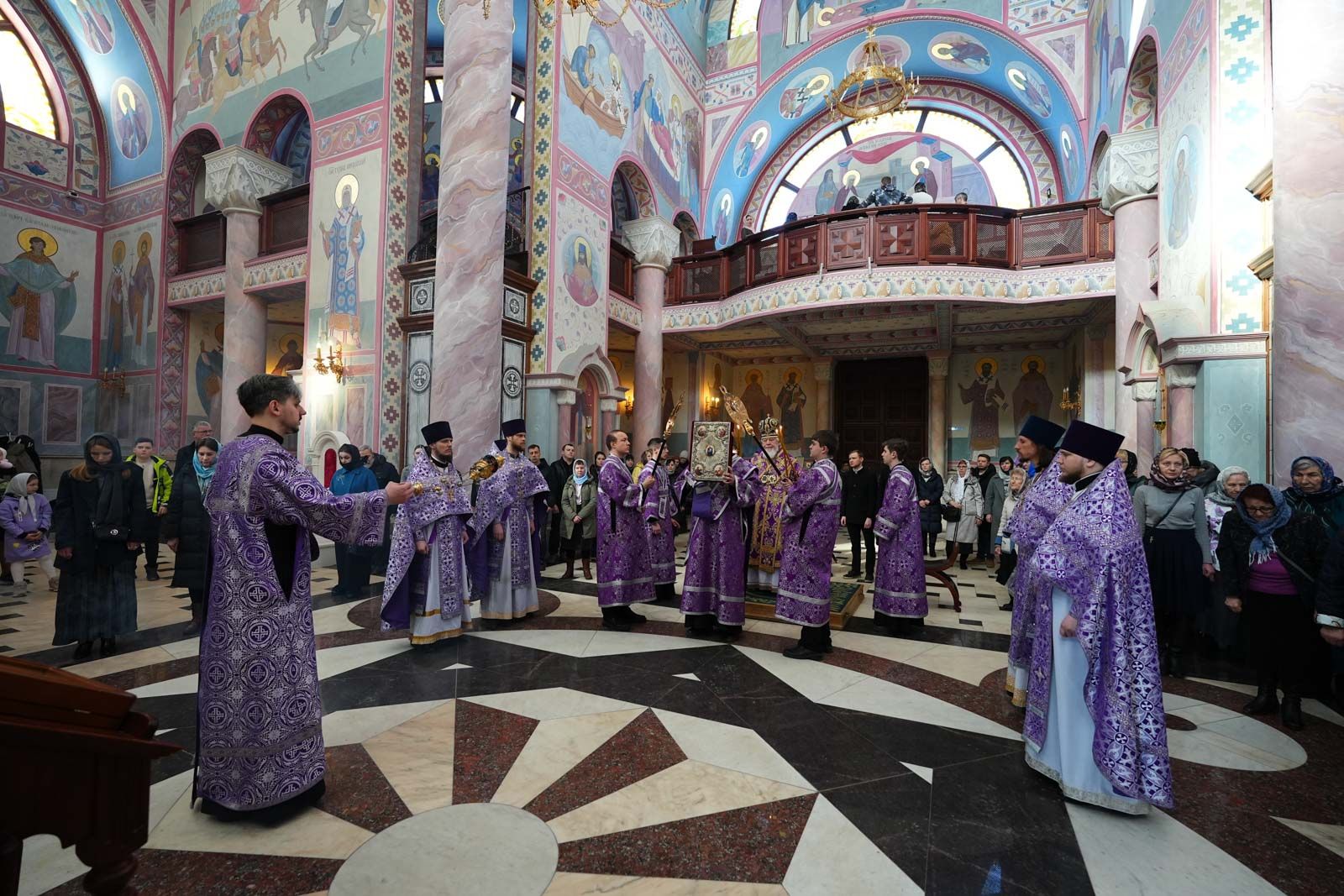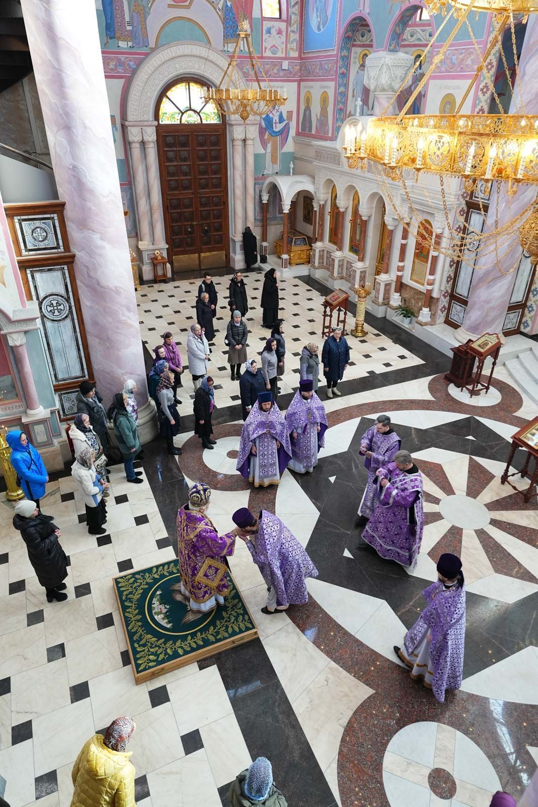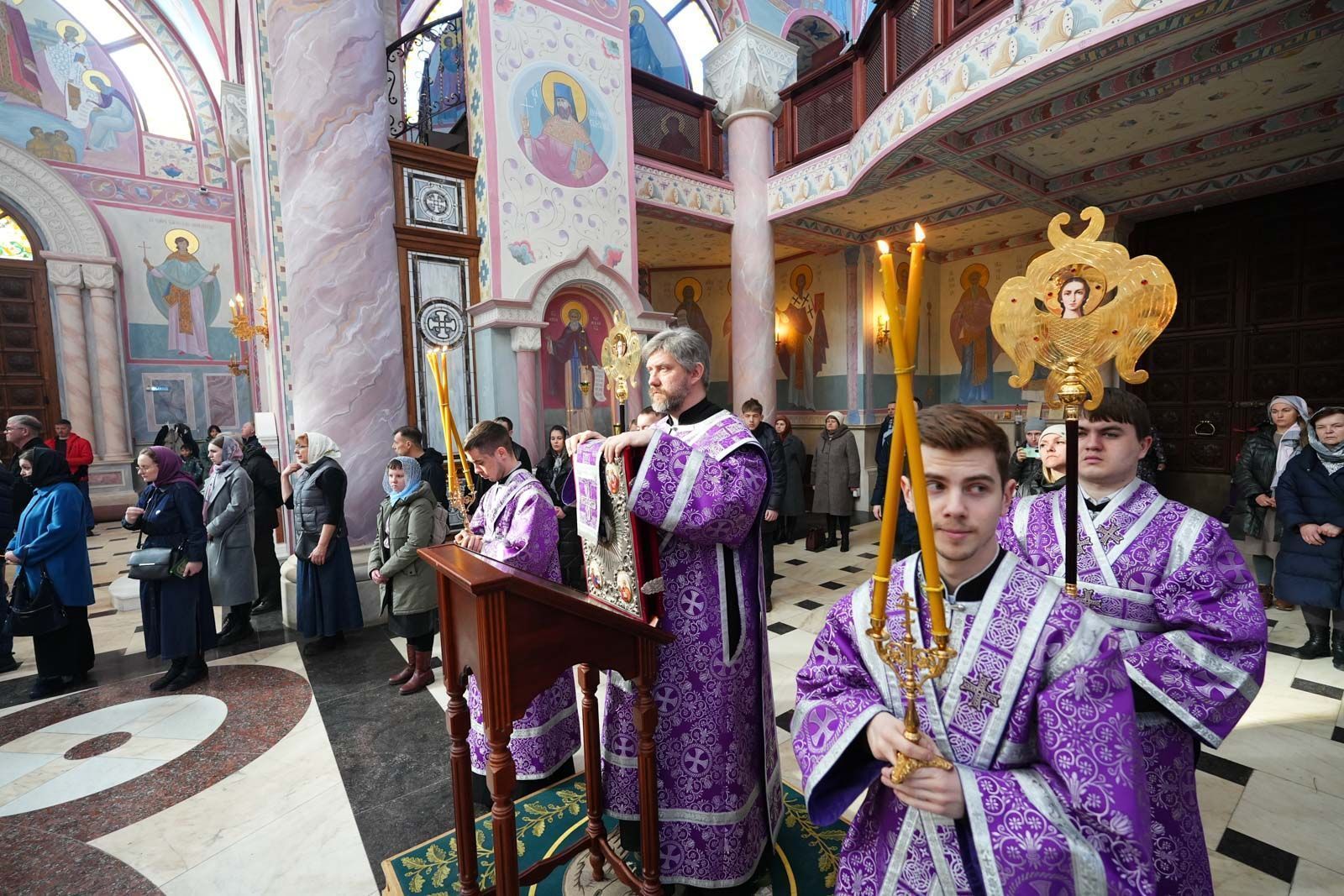 Песнопения литургии исполнил большой хор собора под управлением регента Анастасии Горбатенко.