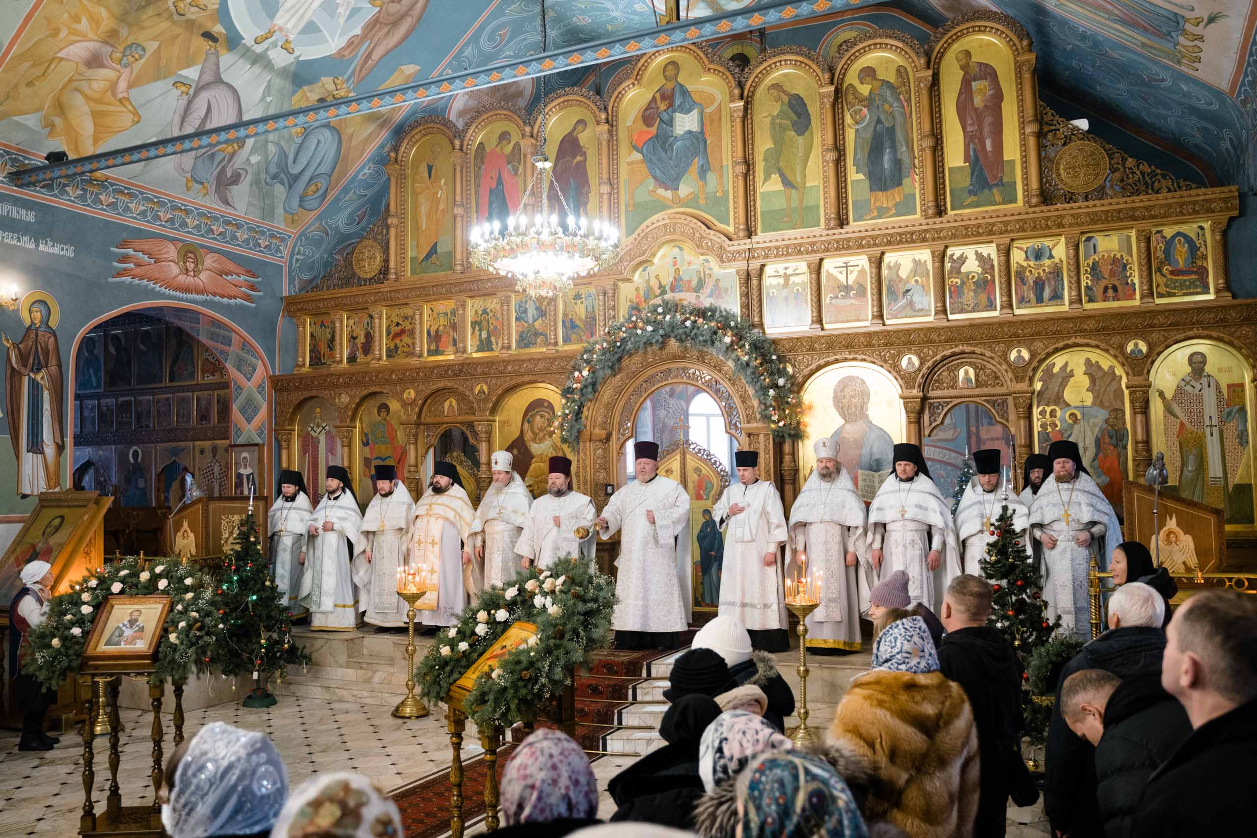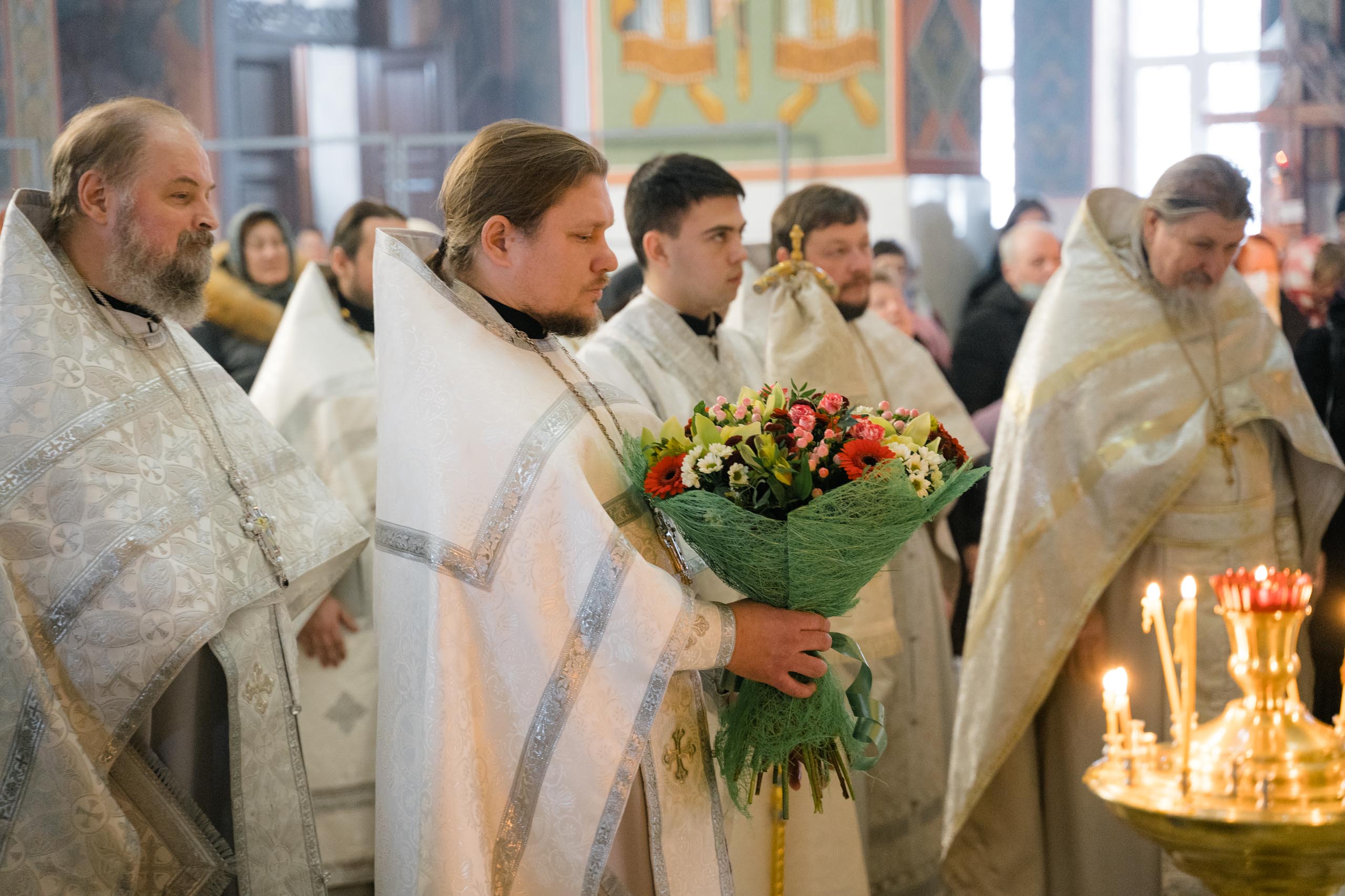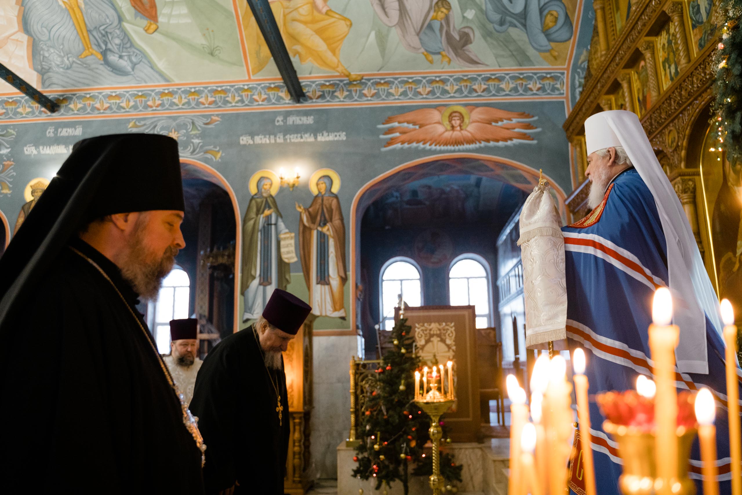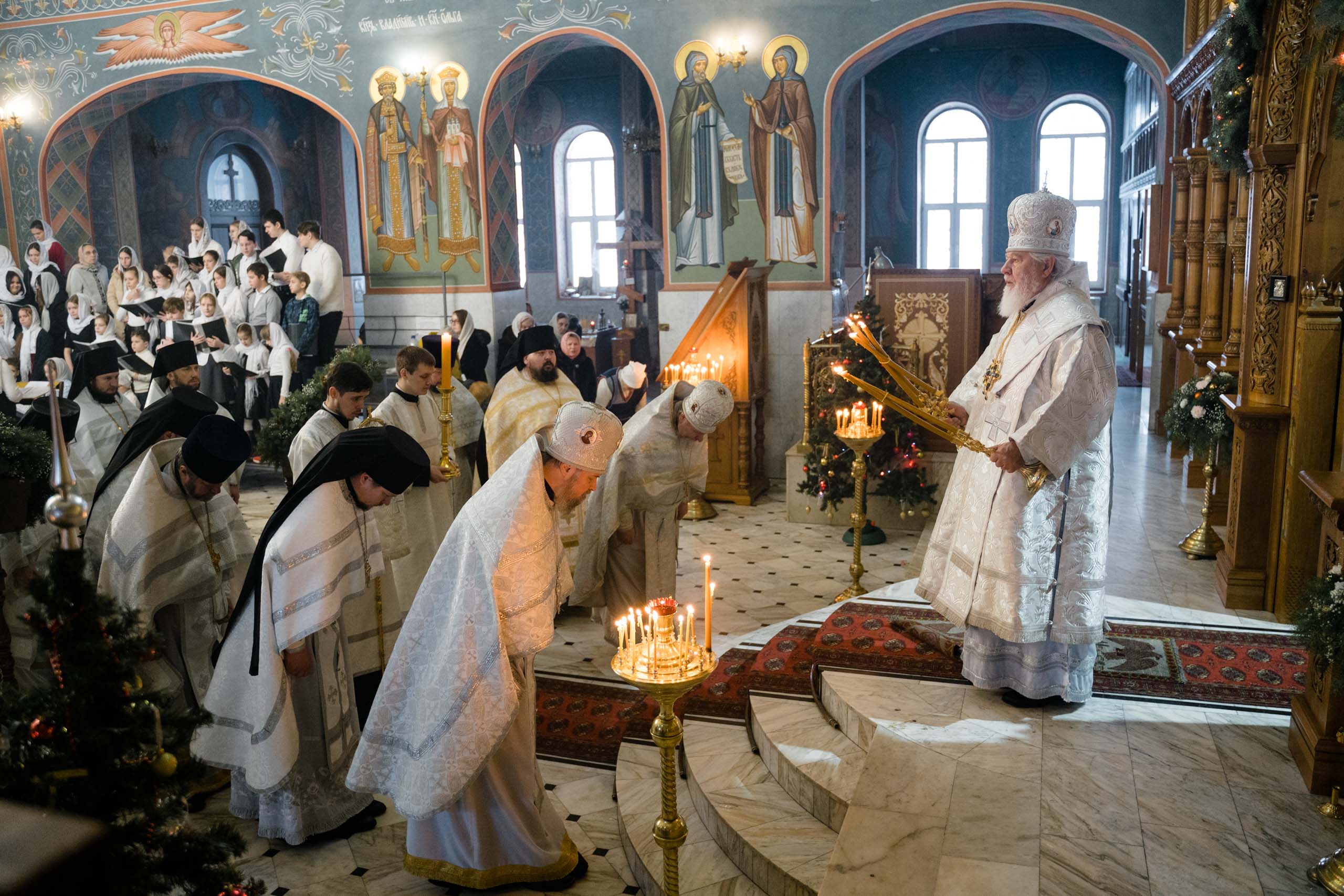 Его Высокопреосвященству сослужили: протоиерей Сергий Пушкарев, секретарь Самарского епархиального управления, настоятель храма Рождества Пресвятой Богородицы пгт Петра Дубрава; игумен Серафим (Астапенко), наместник Воскресенского мужского монастыря г. Самары; архимандрит Вениамин (Лабутин), клирик храма великомученика Георгия Победоносца г. Самары; протоиерей Александр Урывский, настоятель Вознесенского собора г. Самары; братия обители в священном сане и духовенство Самарской епархии. По заамвонной молитве было совершено славление празднику Обрезания Господня и святителю Василию Великому.