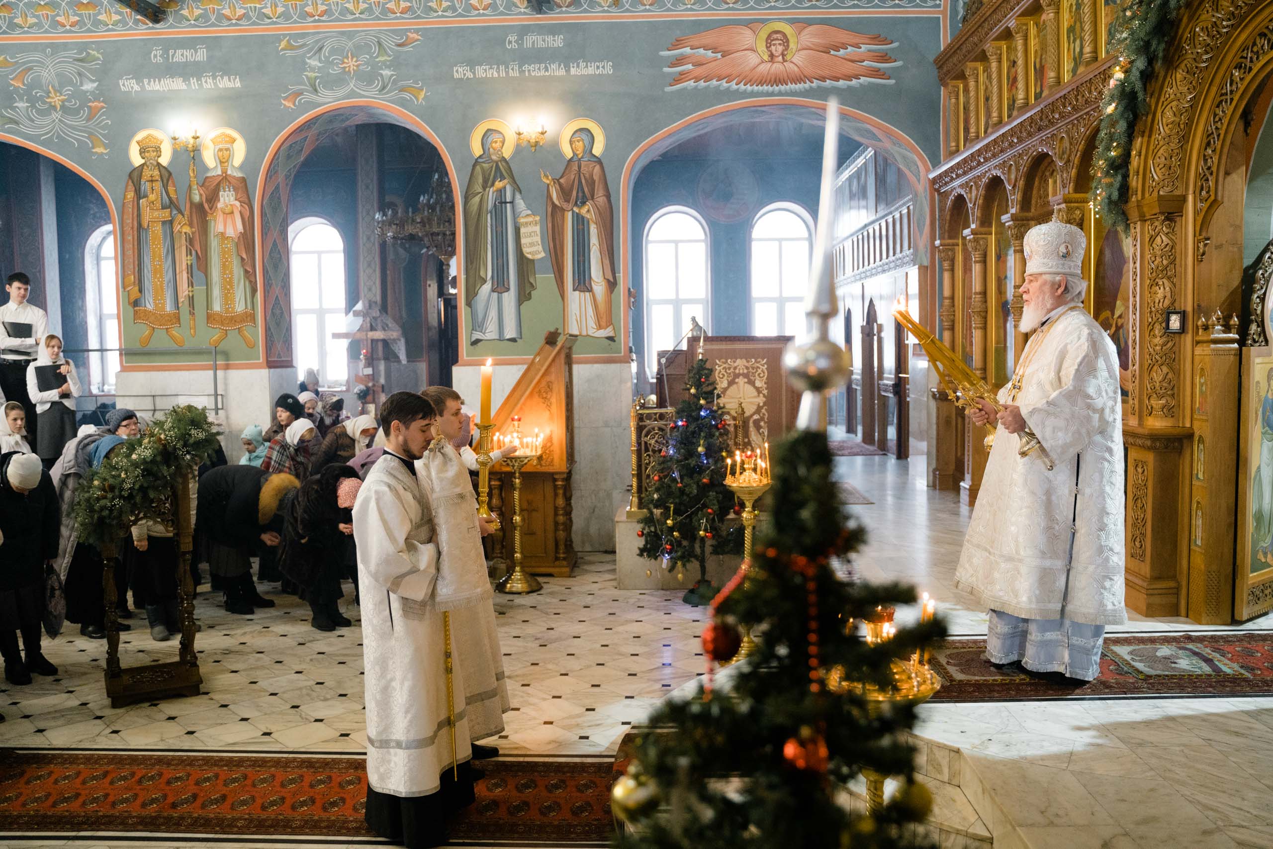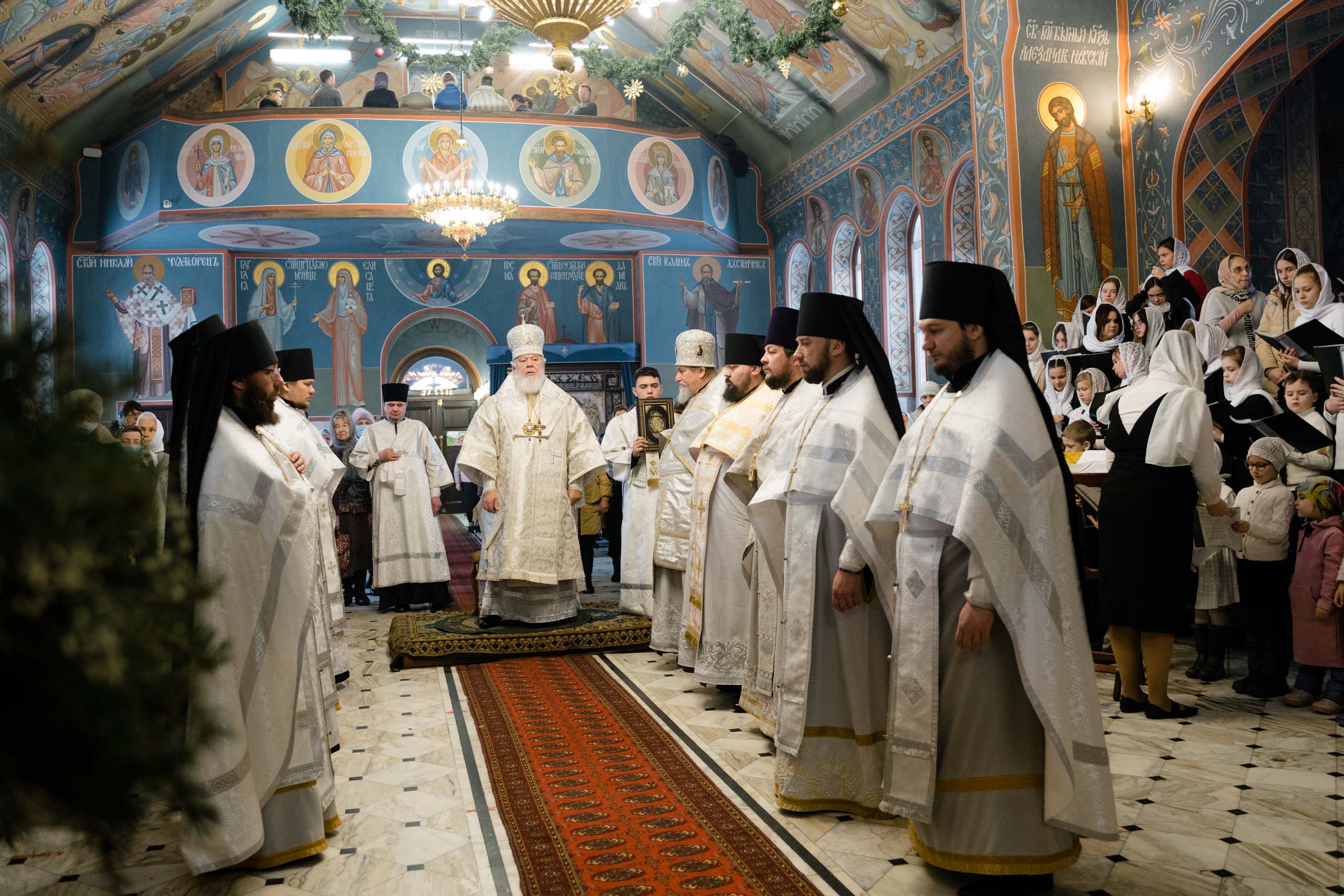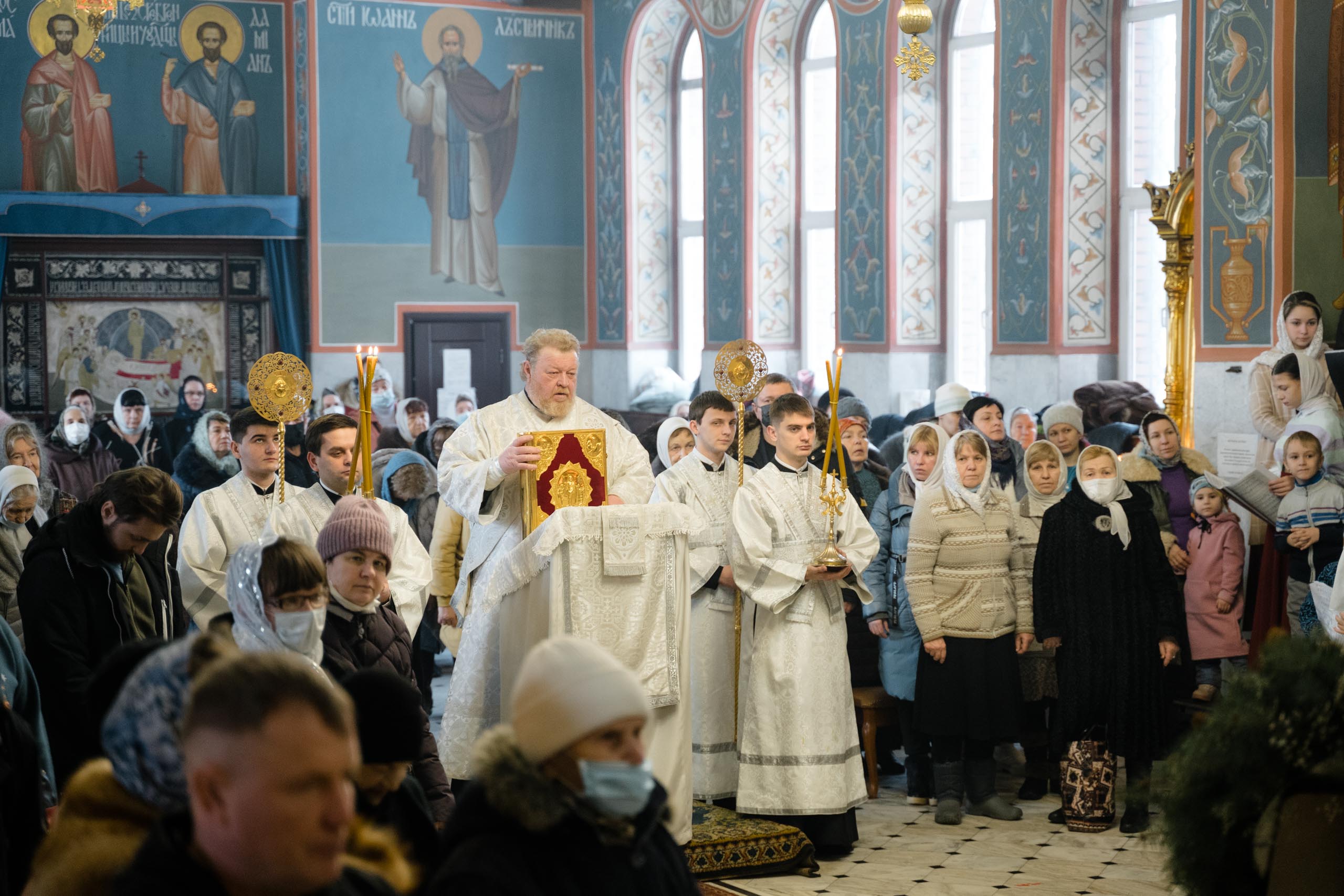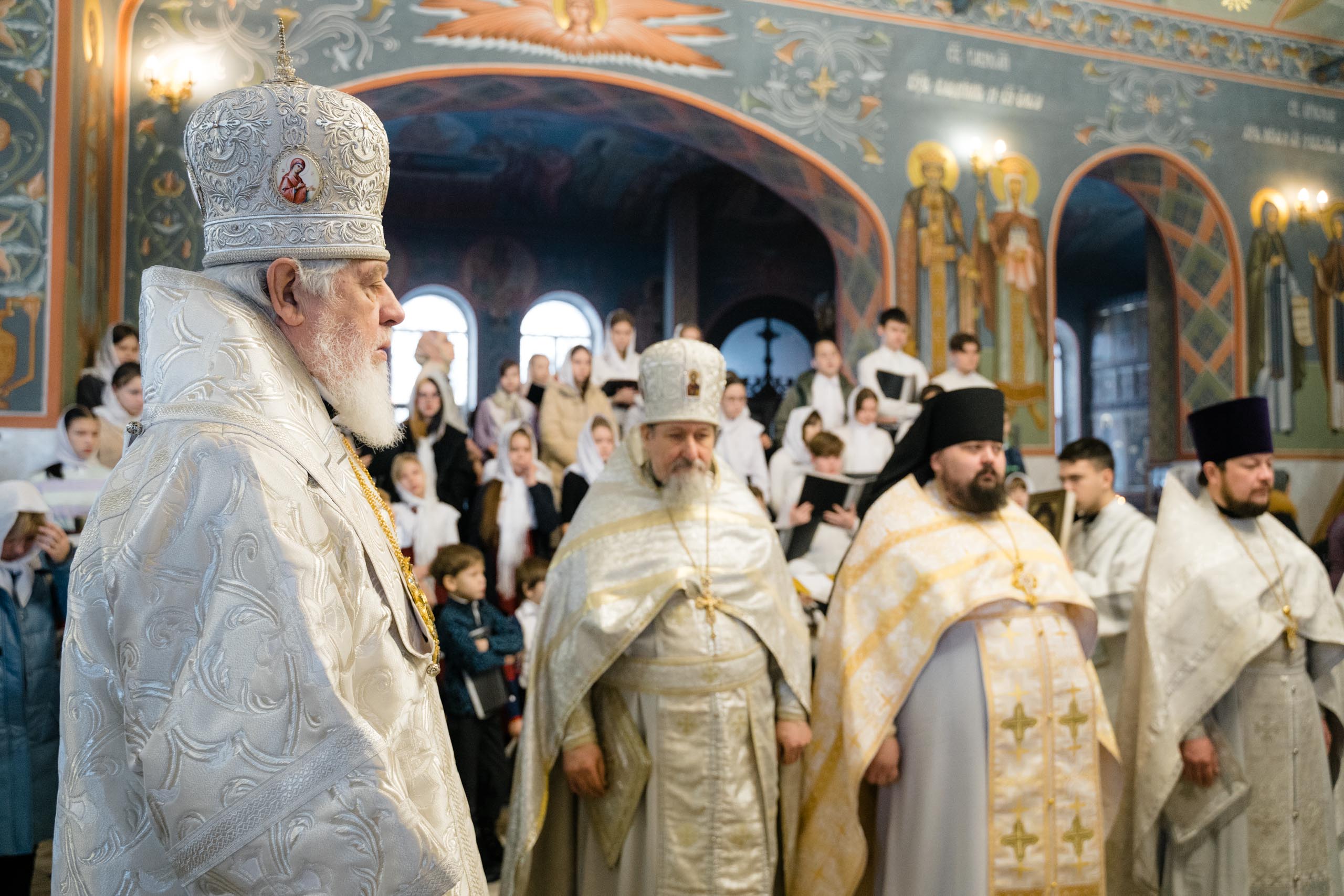 Его Высокопреосвященству сослужили: протоиерей Сергий Пушкарев, секретарь Самарского епархиального управления, настоятель храма Рождества Пресвятой Богородицы пгт Петра Дубрава; игумен Серафим (Астапенко), наместник Воскресенского мужского монастыря г. Самары; архимандрит Вениамин (Лабутин), клирик храма великомученика Георгия Победоносца г. Самары; протоиерей Александр Урывский, настоятель Вознесенского собора г. Самары; братия обители в священном сане и духовенство Самарской епархии. По заамвонной молитве было совершено славление празднику Обрезания Господня и святителю Василию Великому.