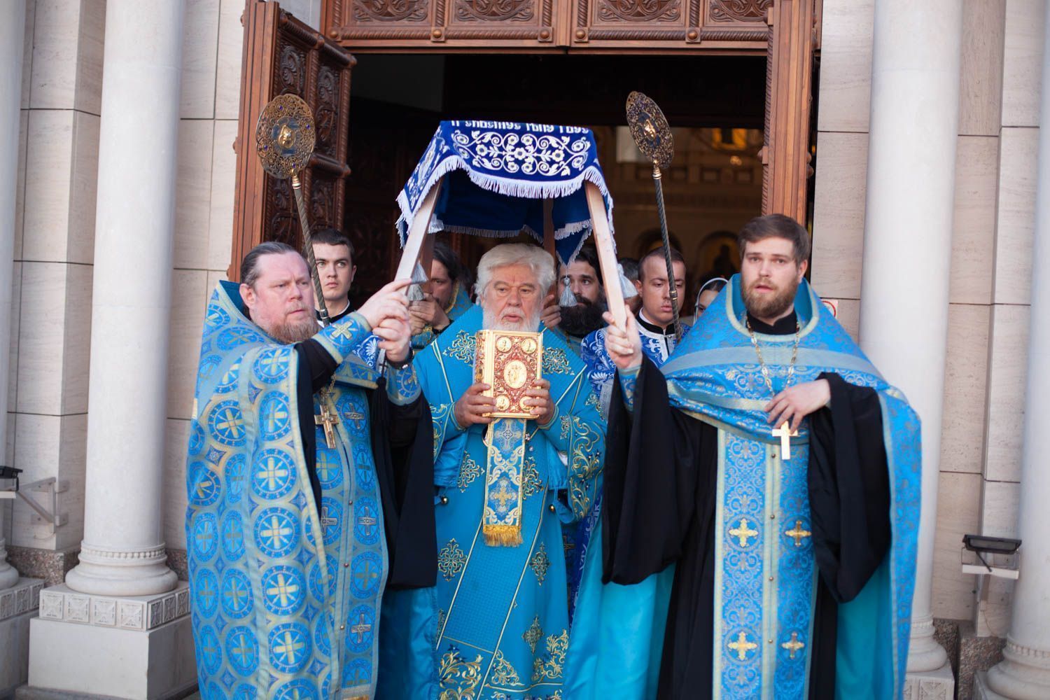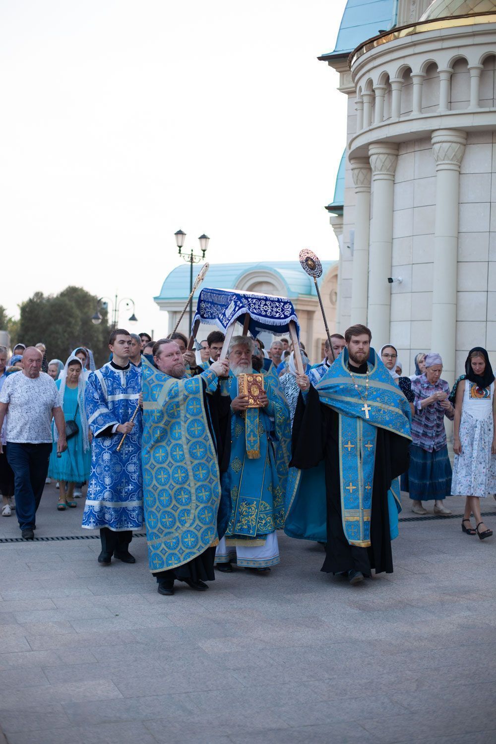 Его Высокопреосвященству сослужили клирики Софийского собора. После великого славословия митрополит Сергий возглавил крестный ход вокруг храма с плащаницей с изображением Успения Пресвятой Богородицы.