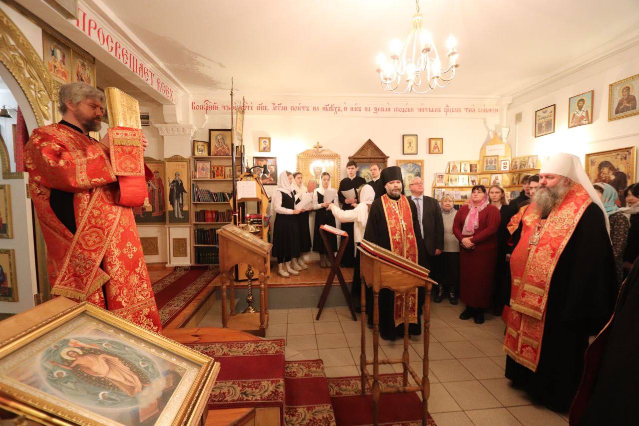 Встреча началась с молебна в университетском храме в честь святой мученицы Татианы, за которым вместе с архипастырем молились настоятель храма иеромонах Герасим (Вертей), ректор СамГТУ Дмитрий Быков, представители руководства вуза, студенты и прихожане.