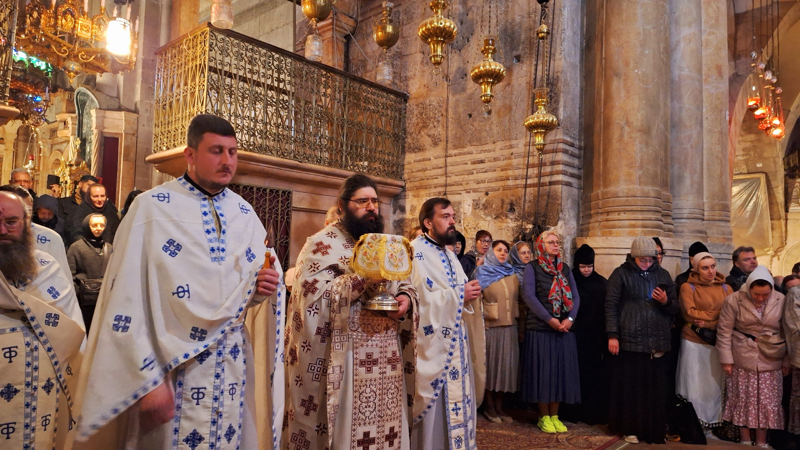 Песнопения утрени и Литургии исполнил братский хор Храма Гроба Господня. Богослужение было совершено на греческом, церковнославянском и арабском языках.