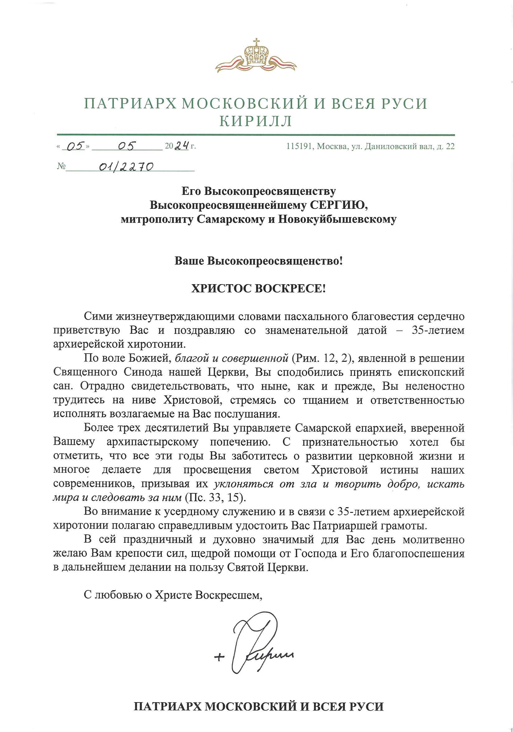 10 мая 2024 г. в день празднования в честь иконы Божией Матери "Живоносный Источник" правящий архиерей Самарской епархии, митрополит Сергий отмечает 35-летие со дня своей епископской хиротонии. Высокопреосвященнейшего Сергия поздравил с знаменательной датой Святейший Патриарх Московский и всея Руси Кирилл и удостоил его Патриаршей грамоты во внимание к усердному служению.