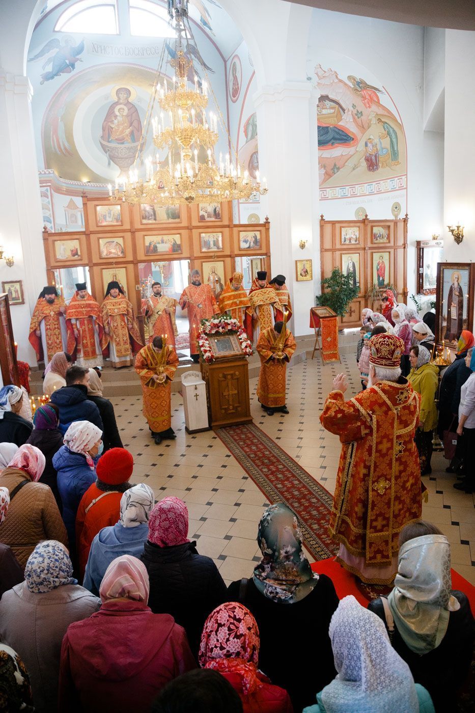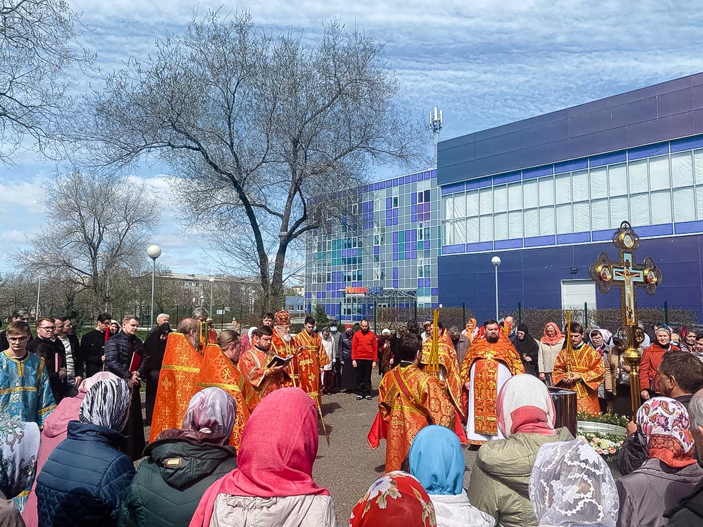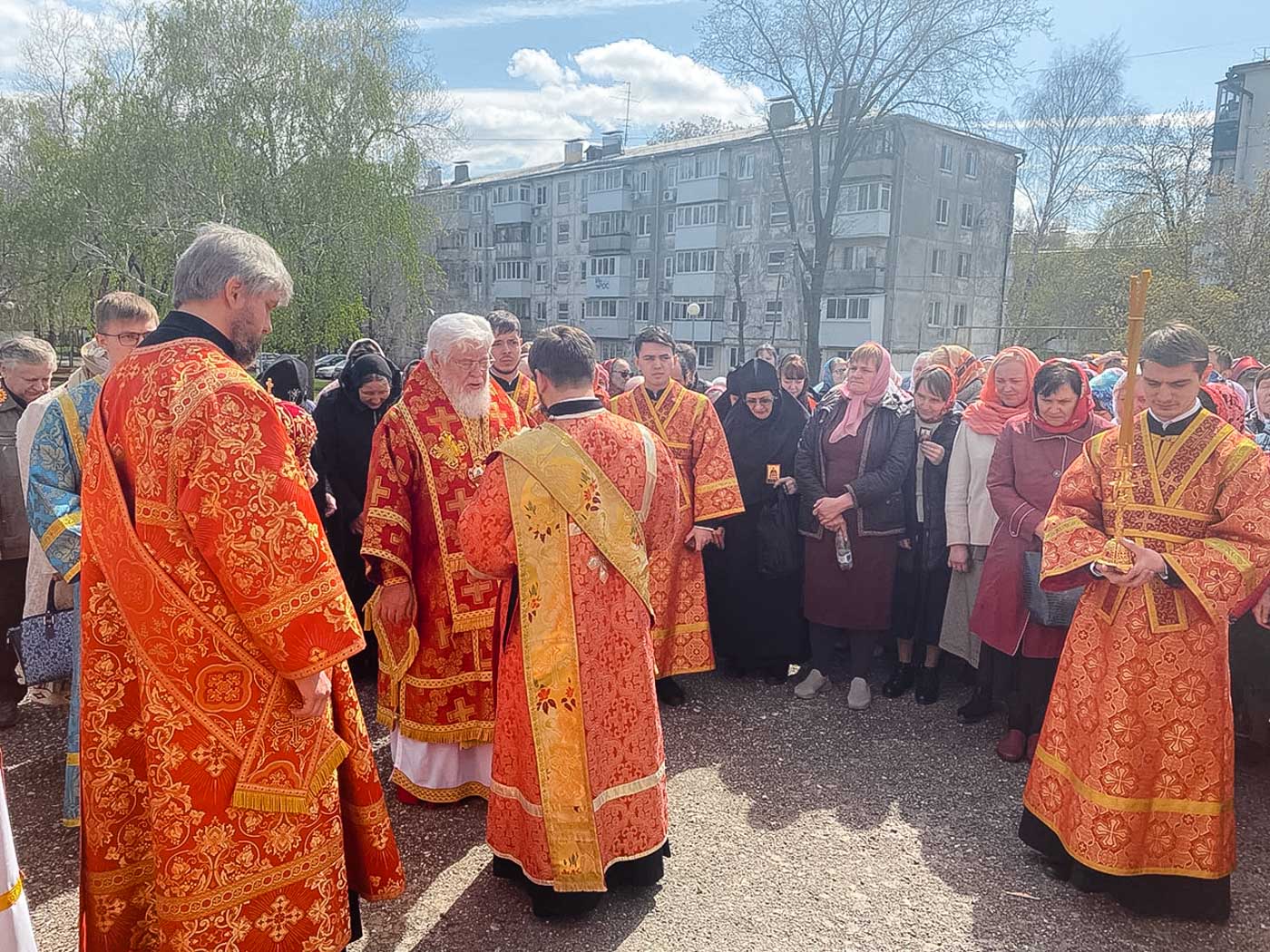 По окончании Литургии владыка возглавил чин молебного пения с малым водоосвящением, после чего был совершен праздничный крестный ход вокруг храма.