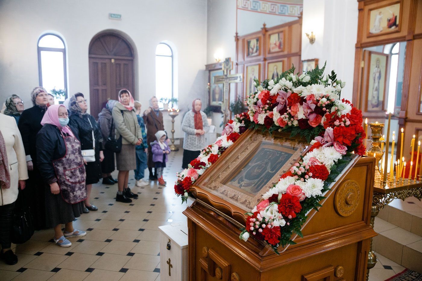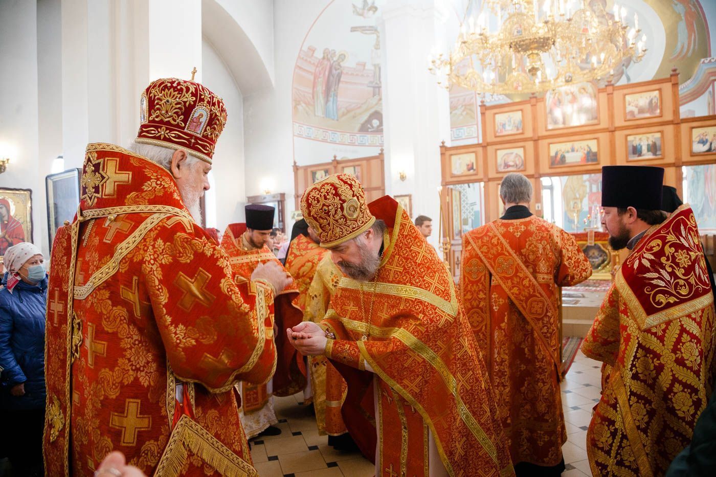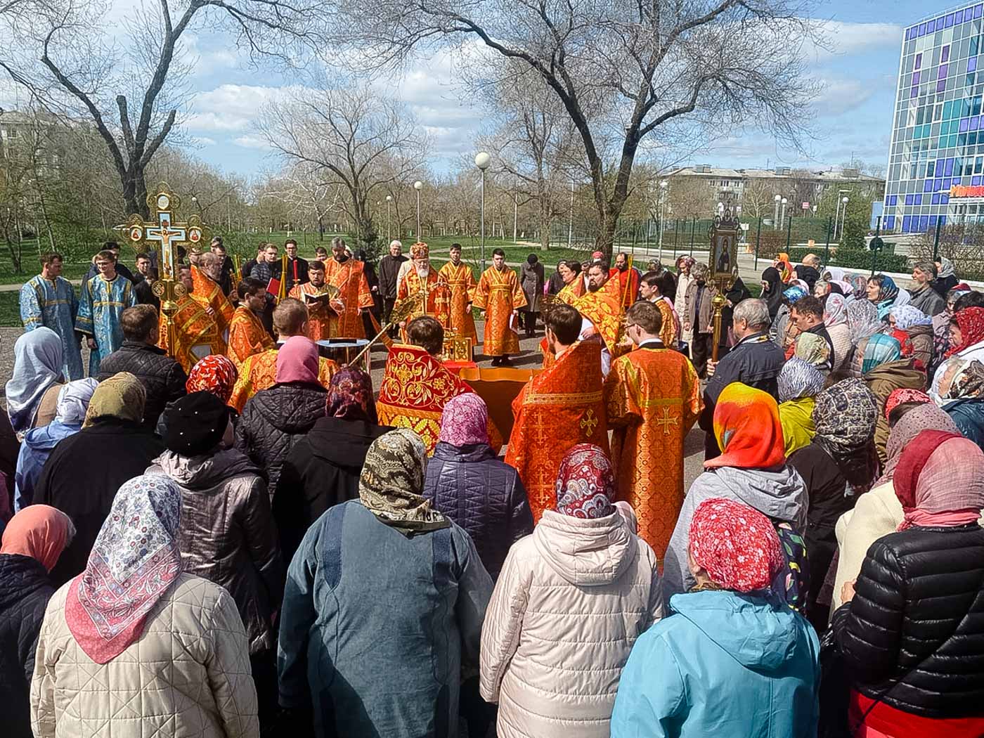 По окончании Литургии владыка возглавил чин молебного пения с малым водоосвящением, после чего был совершен праздничный крестный ход вокруг храма.