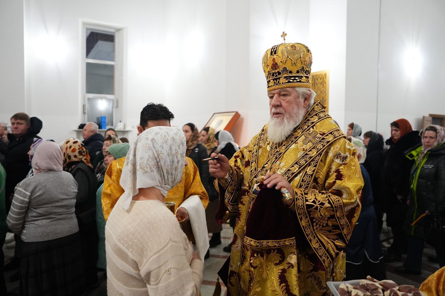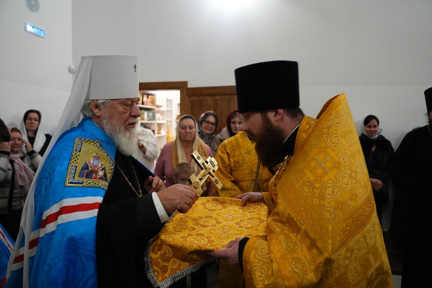 По окончании богослужения настоятель храма иеромонах Федор (Будаев) приветствовал правящего архиерея и преподнес ему в дар панагию с изображением Воскресшего Христа.