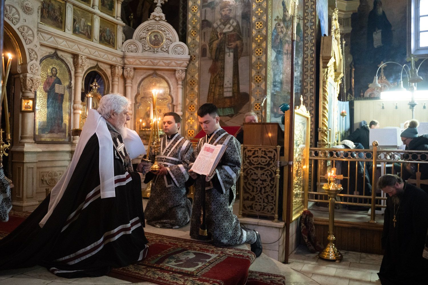 После пения великого прокимна и закрытия Царских врат митрополит Сергий и духовенство переоблачились в великопостные черные ризы.