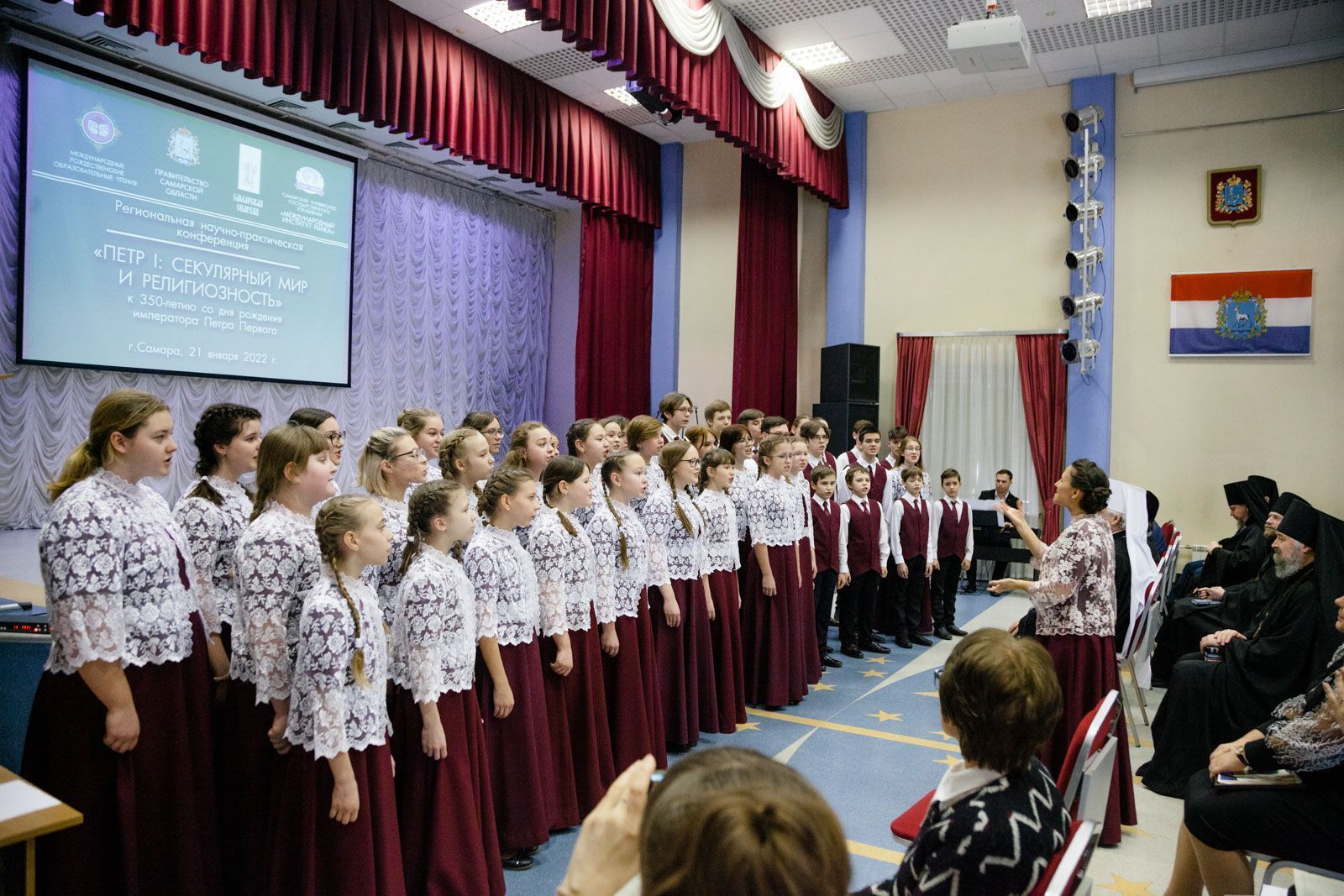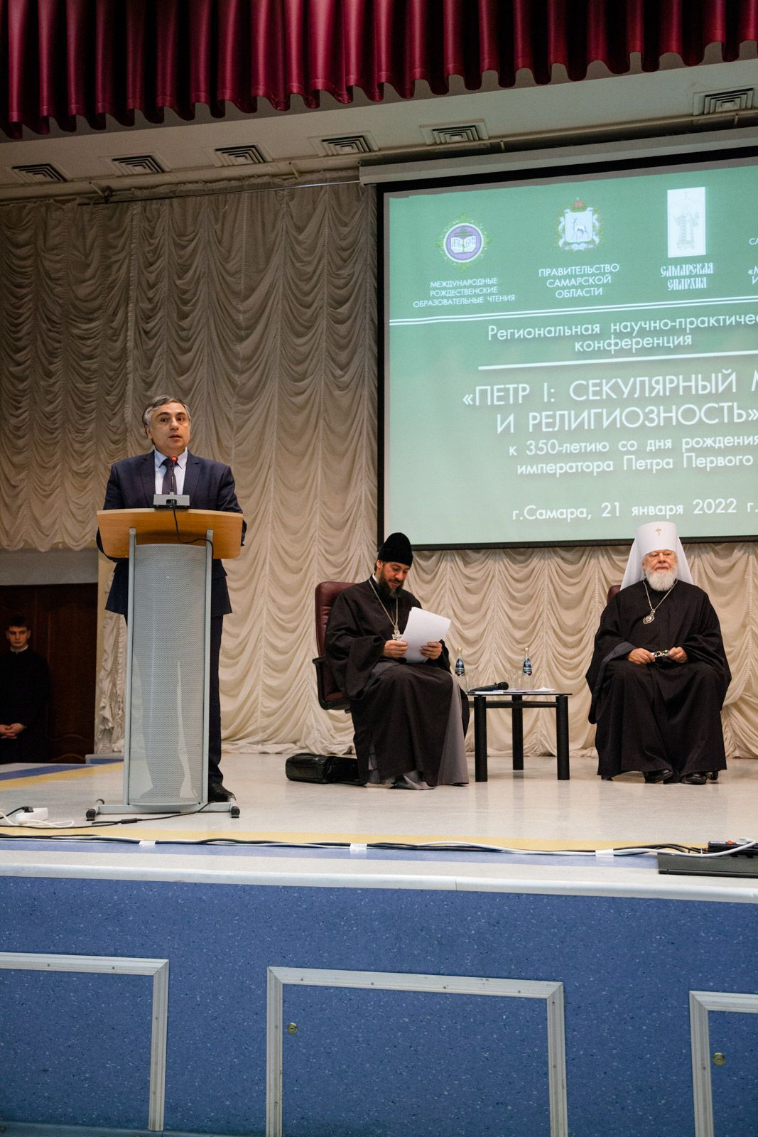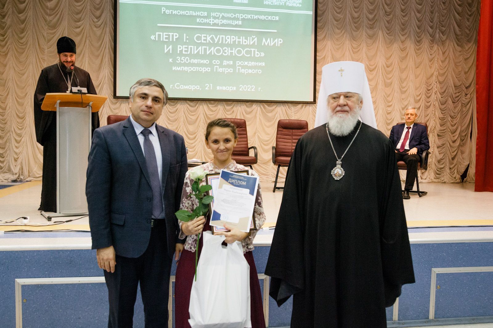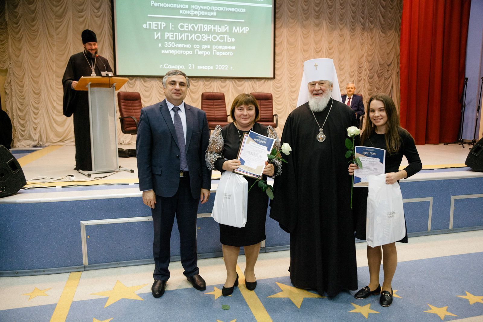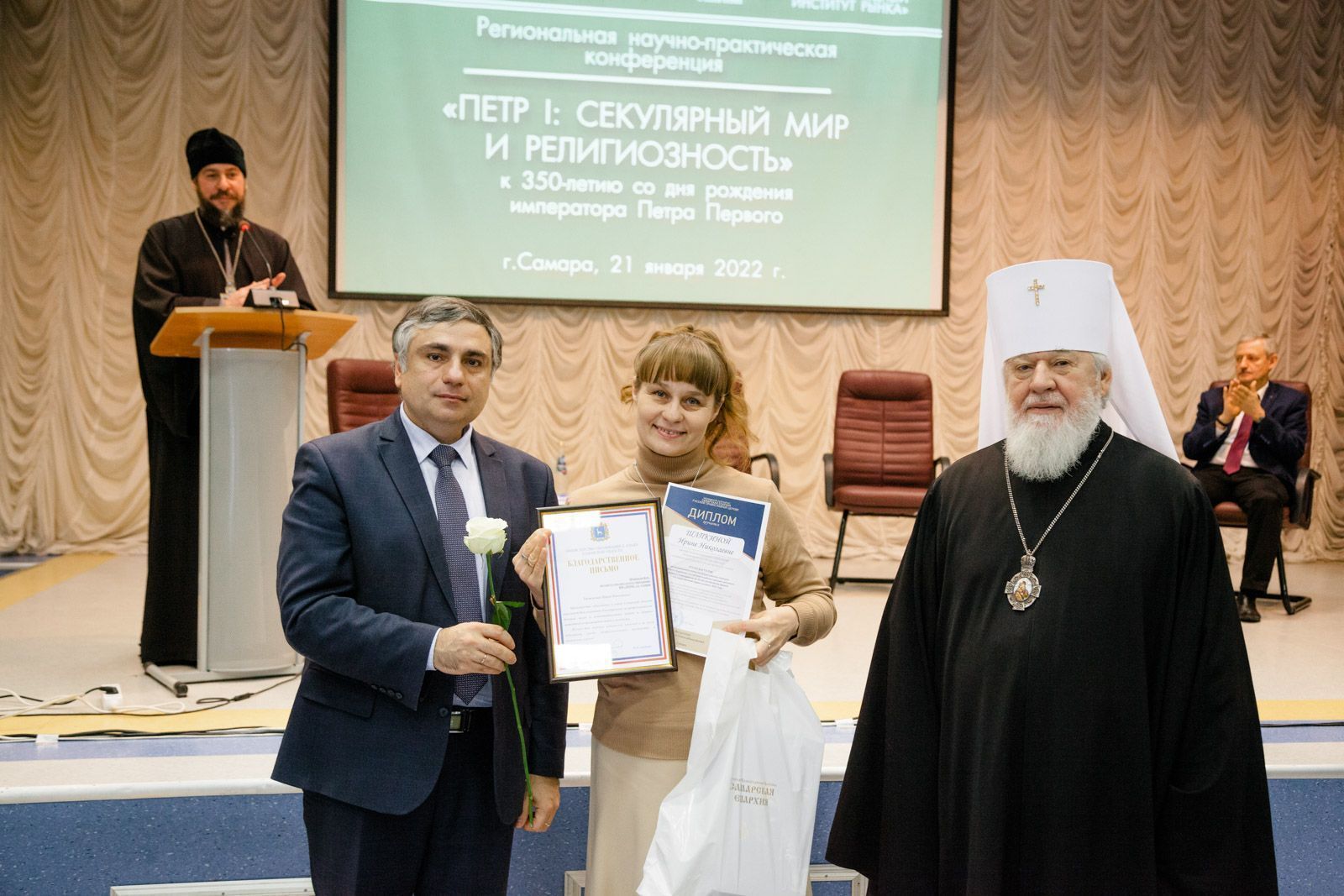 После награждения прошла региональная научно-практическая конференция «Петр I: секулярный мир и религиозность», приуроченная к 350-летию со дня рождения императора Петра Первого. В ходе конференции с докладами выступили: архимандрит Вениамин (Лабутин), заведующий межвузовской кафедрой теологии и истории религий, кандидат богословия, на тему: «Петр Великий: личность и время»; Леонид Петрович Решетников, президент Некоммерческого благотворительного фонда «Наследие», заведующий кафедрой истории Московского государственного института культуры, кандидат исторических наук, генерал-лейтенант в отставке, на тему: «Геополитическое пространство современной России: нравственные уроки»; протоиерей Димитрий Лескин, ректор Поволжской академии образования и искусств им. Святителя Алексия, доктор философских наук, на тему: «Воспитание как основа образования: возвращение к истокам», а также Аркадий Эммануилович Левин, генеральный директор Центра культурных инициатив «Сретение», на тему: «Мультимедийный проект: «Живая поэзия»/«Круг лета Господня». Концерт детского хора «Созвучие» под управлением Лёвиной М. В. и Губернского мужского хора «София» под управлением игумена Никона (Ратникова) завершил насыщенную программу конференции.