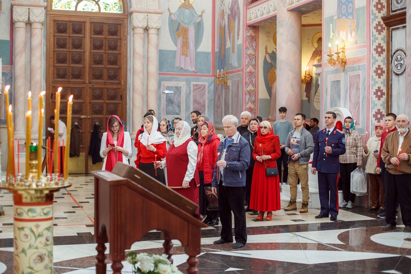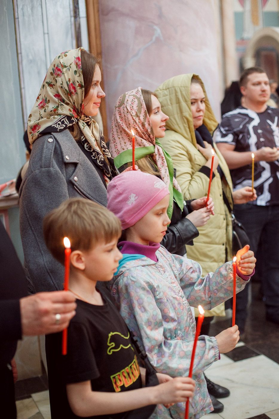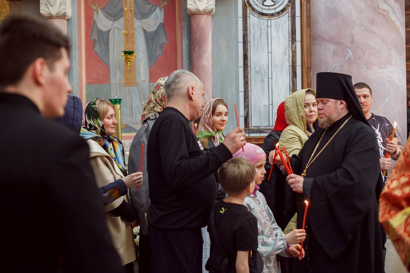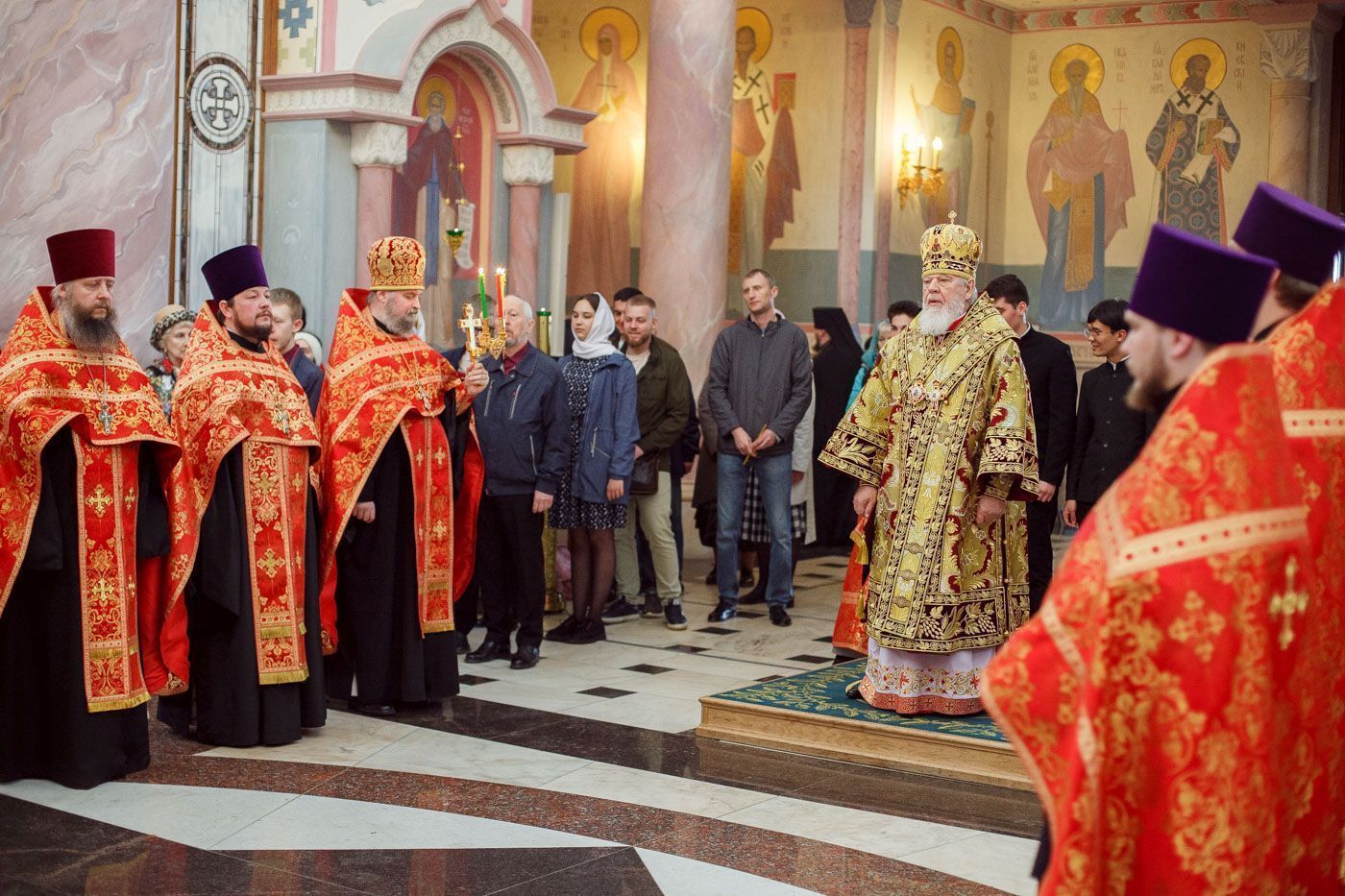К началу Пасхальной вечерни в собор был доставлен Благодатный огонь, сошедший накануне в Храме Гроба Господня в Иерусалиме.
