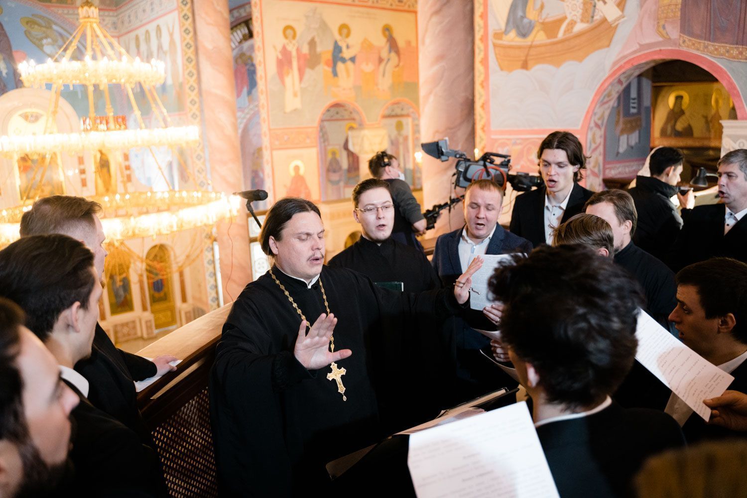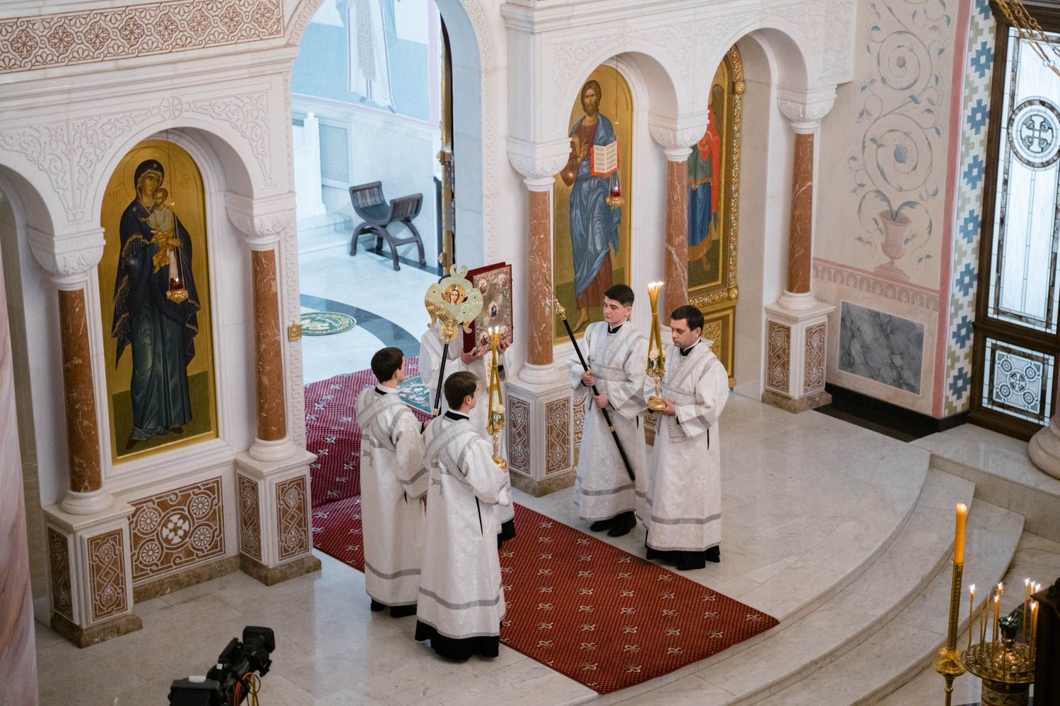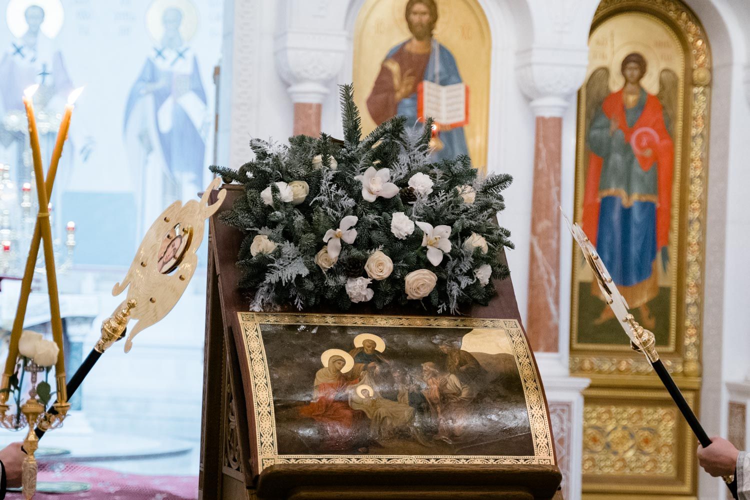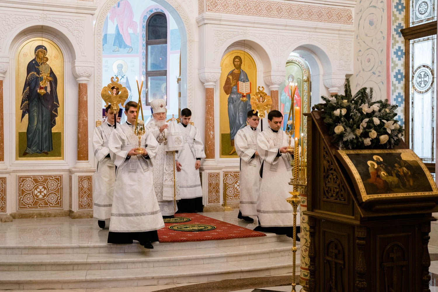 «Днесь рождает Дева Творца всех: Едем приносит вертеп, и звезда показывает Христа, Солнца сущим во тьме. С дары волхви поклонишася, верою просвещаеми: и пастыри видеша чудо, Ангелом воспевающим и глаголющим: слава в вышних Богу»