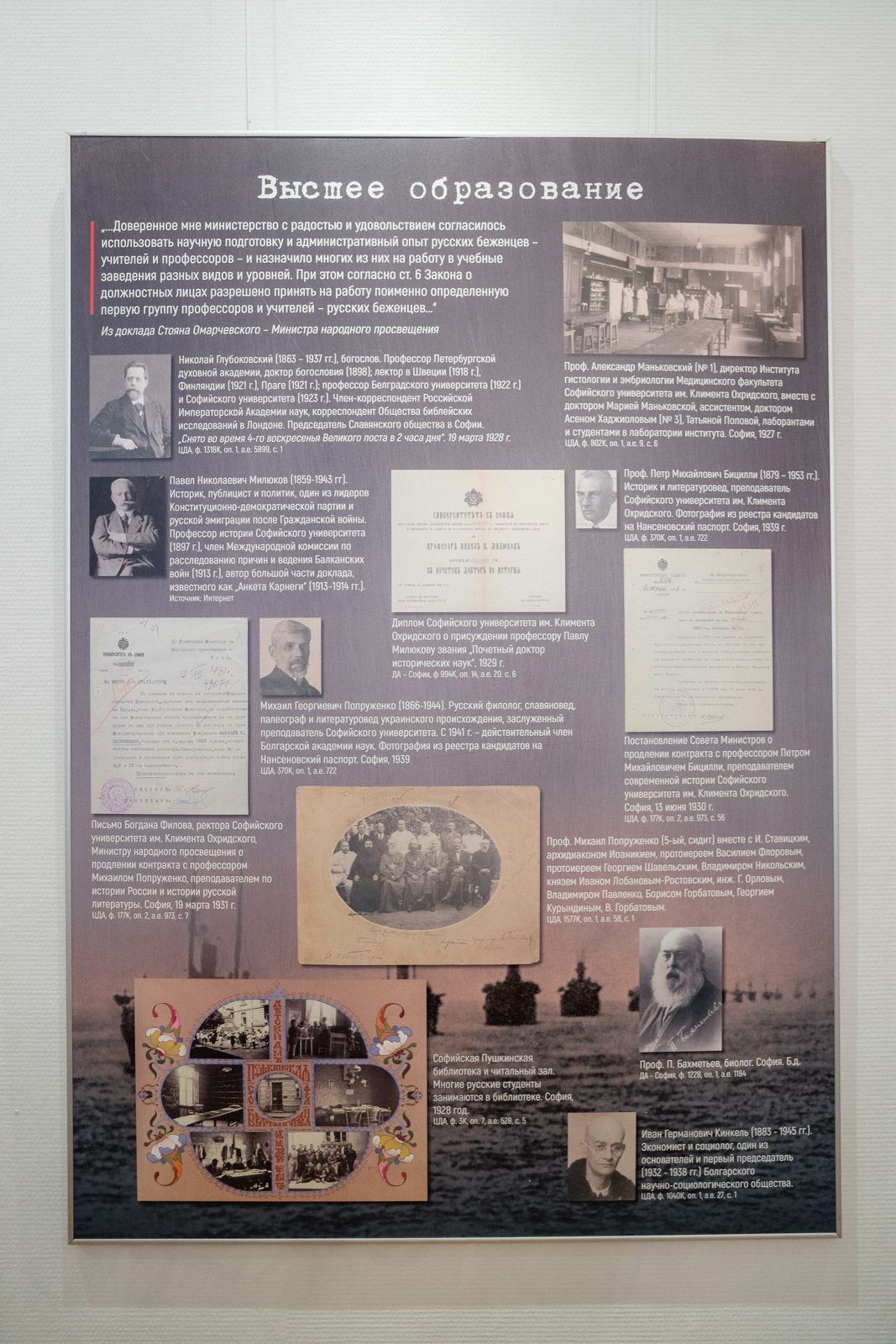 «Во время и после окончания Гражданской войны в России десятки тысяч гражданских и военных эмигрантов прибыли в Болгарию из Советской России. Этот процесс заселения продолжился и после 1921 года. Трудно оценить точное число эмигрантов, но, по мнению исследователей, продолжительное время в Болгарии пребывало около 45 тысяч эмигрантов. Они встретили гостеприимство болгарского народа, государства и Болгарской Православной церкви со своей стороны эмигранты и беженцы из России внесли большой вклад в развитие и подъем Болгарии в период между двумя Мировыми войнами. Болгария нашла возможность для интеграции десятков тысяч беженцев, спасающихся от большевистского террора, которые полноценно включились во все сферы общественной жизни страны.
