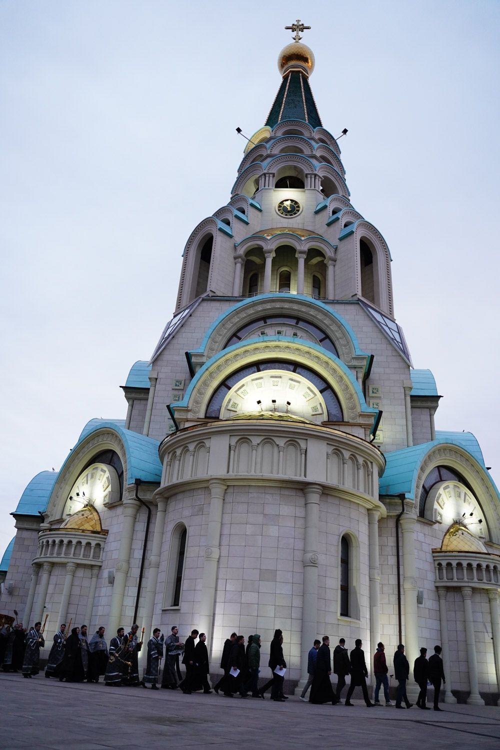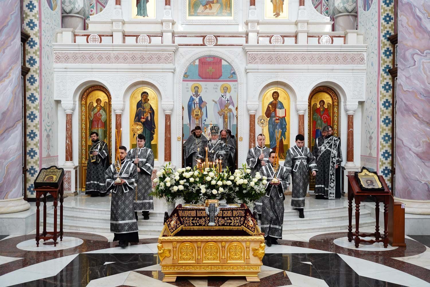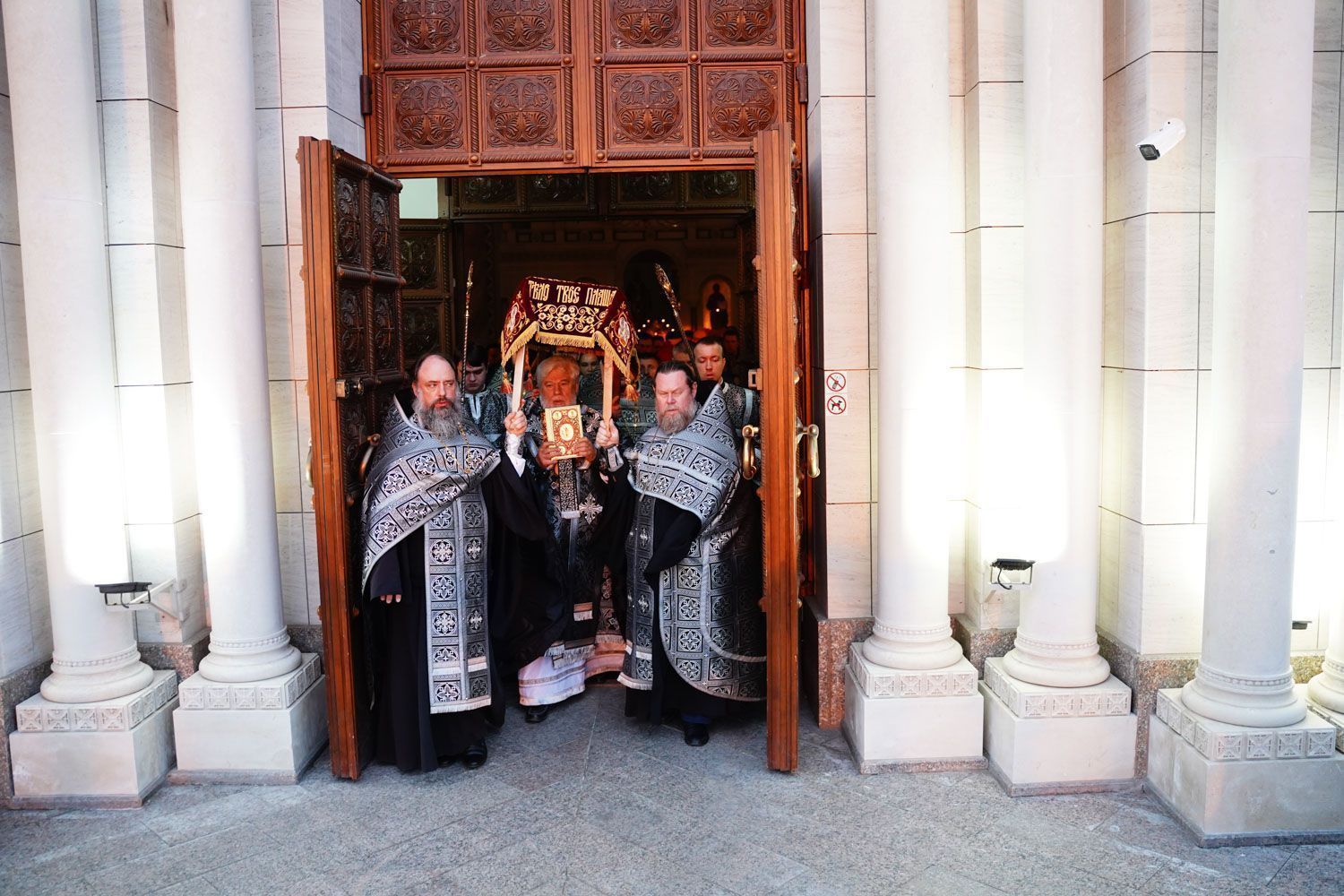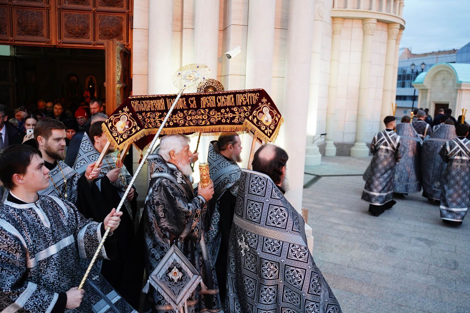 После великого славословия под пение погребального «Святый Боже» был совершен крестный ход с Плащаницей.