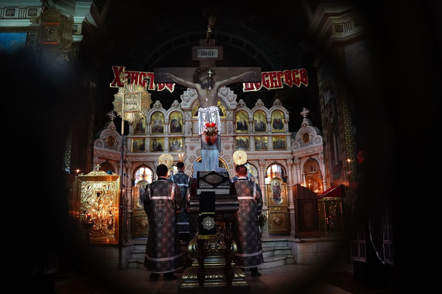 Перед Распятием в центре храма были прочитаны 12 Евангельских отрывков о Страданиях (Страстях) Христовых, начиная с Прощальной беседы Спасителя с учениками-апостолами (Ин. 13:31-18:1), о предании Его Иудой, взятии Христа в Гефсиманском саду, мучениях, распятии и Крестной смерти.