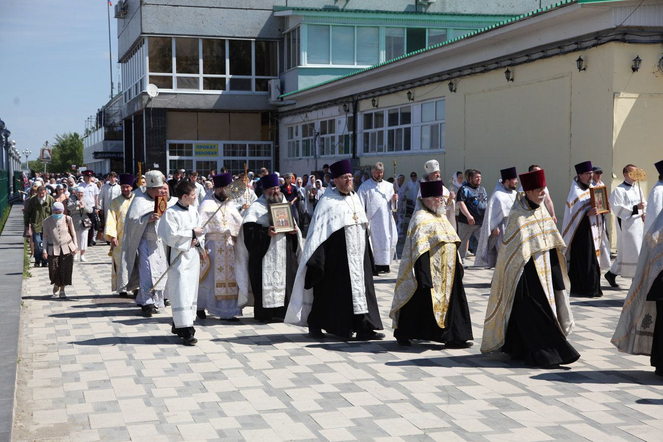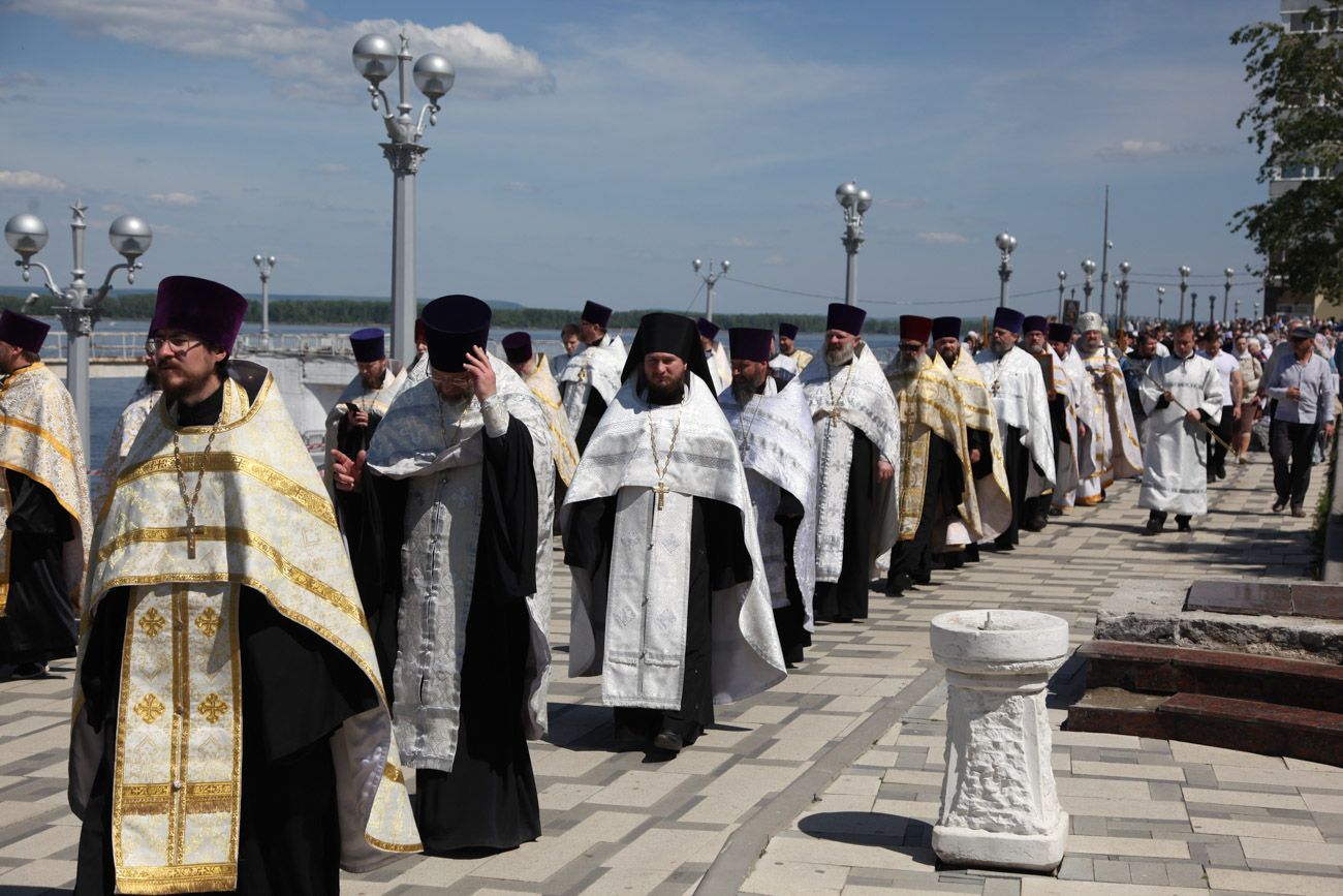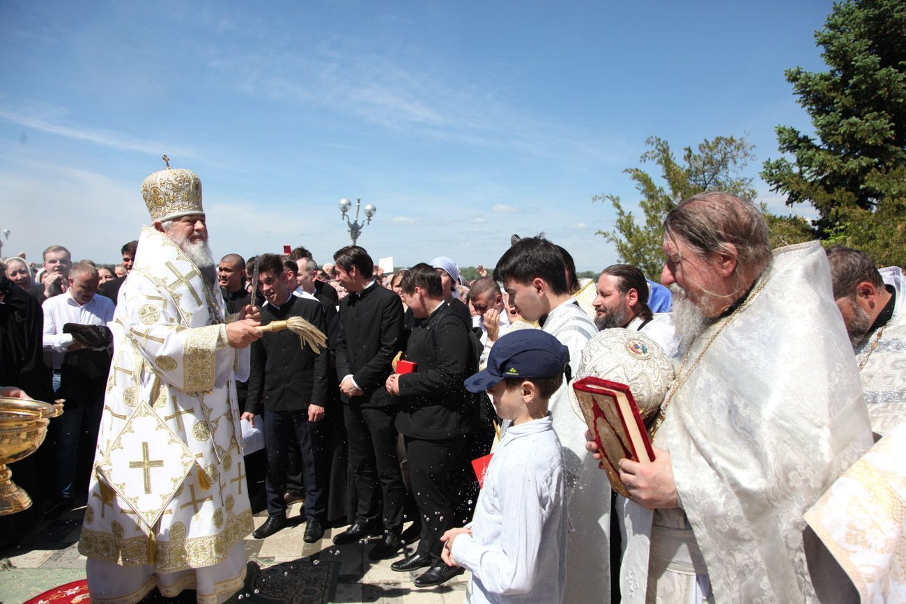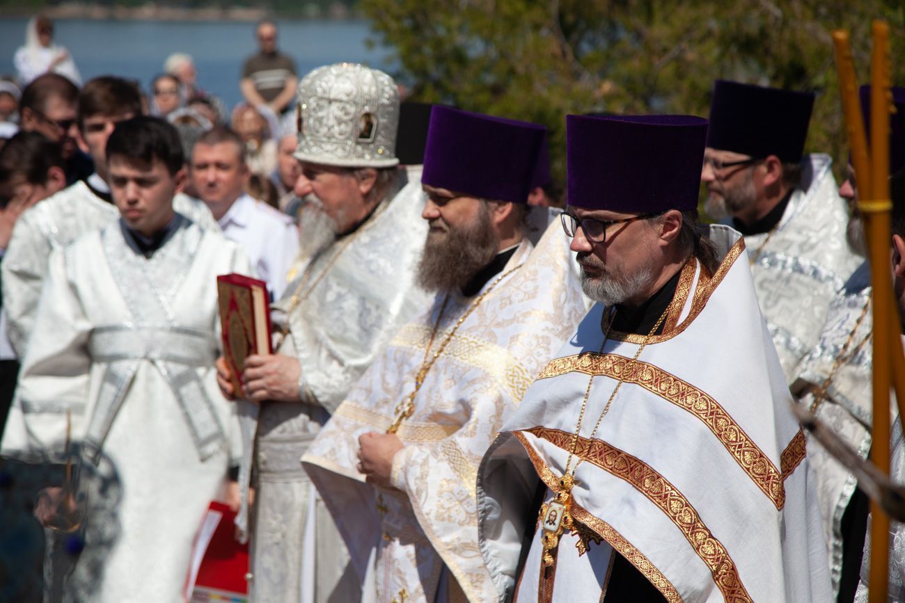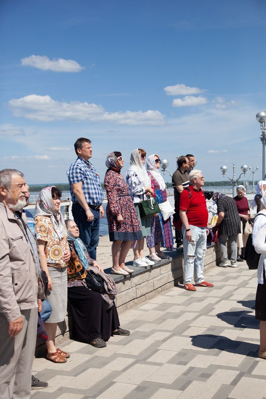 К крестному ходу присоединяются все новые горожане, в том числе верующие Вознесенского собора. Крестный ход вступает на Алексиевскую набережную и растекается вокруг часовни. И сразу начинается водосвятный молебен.