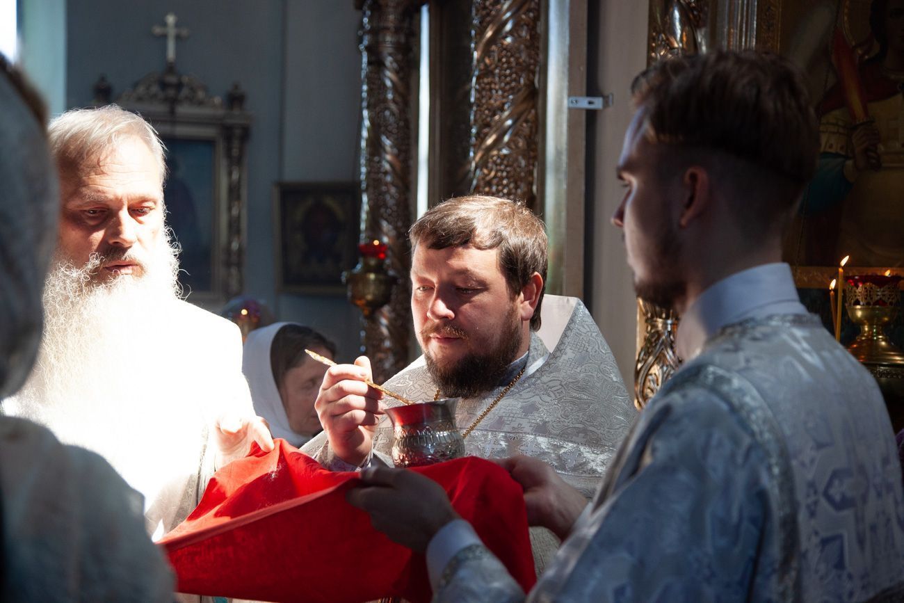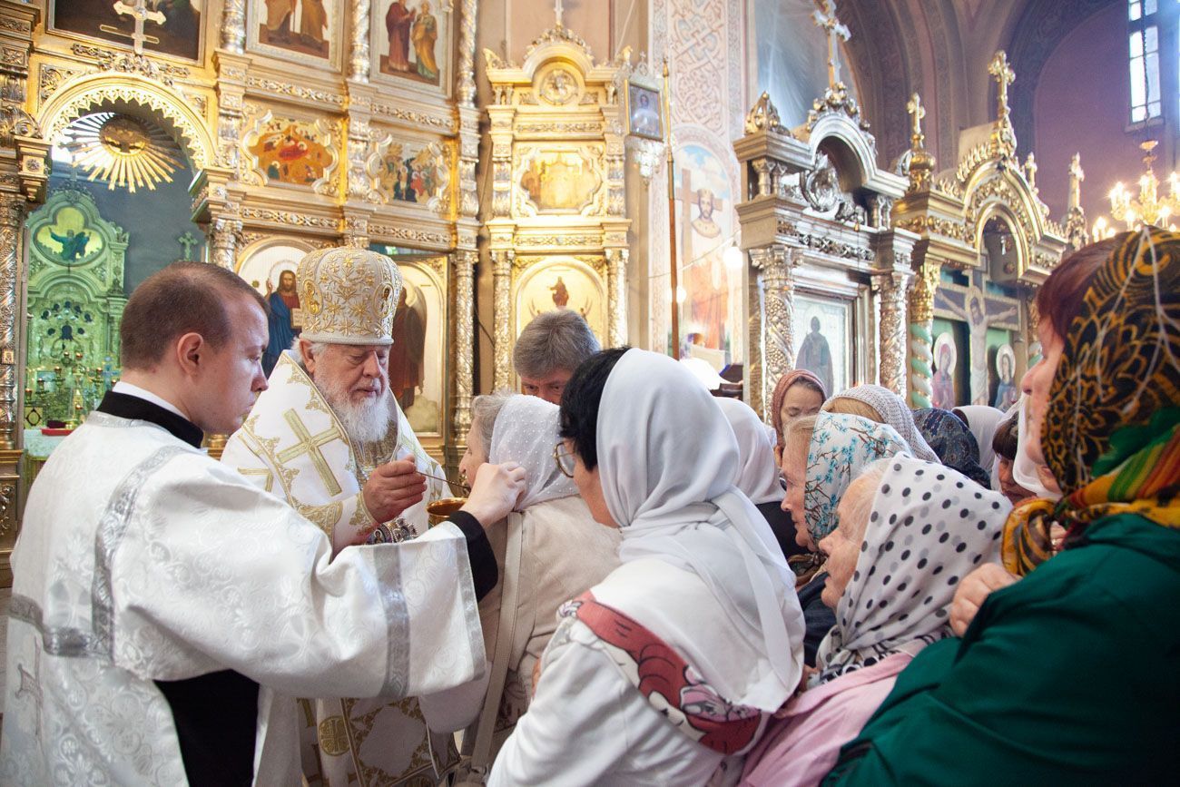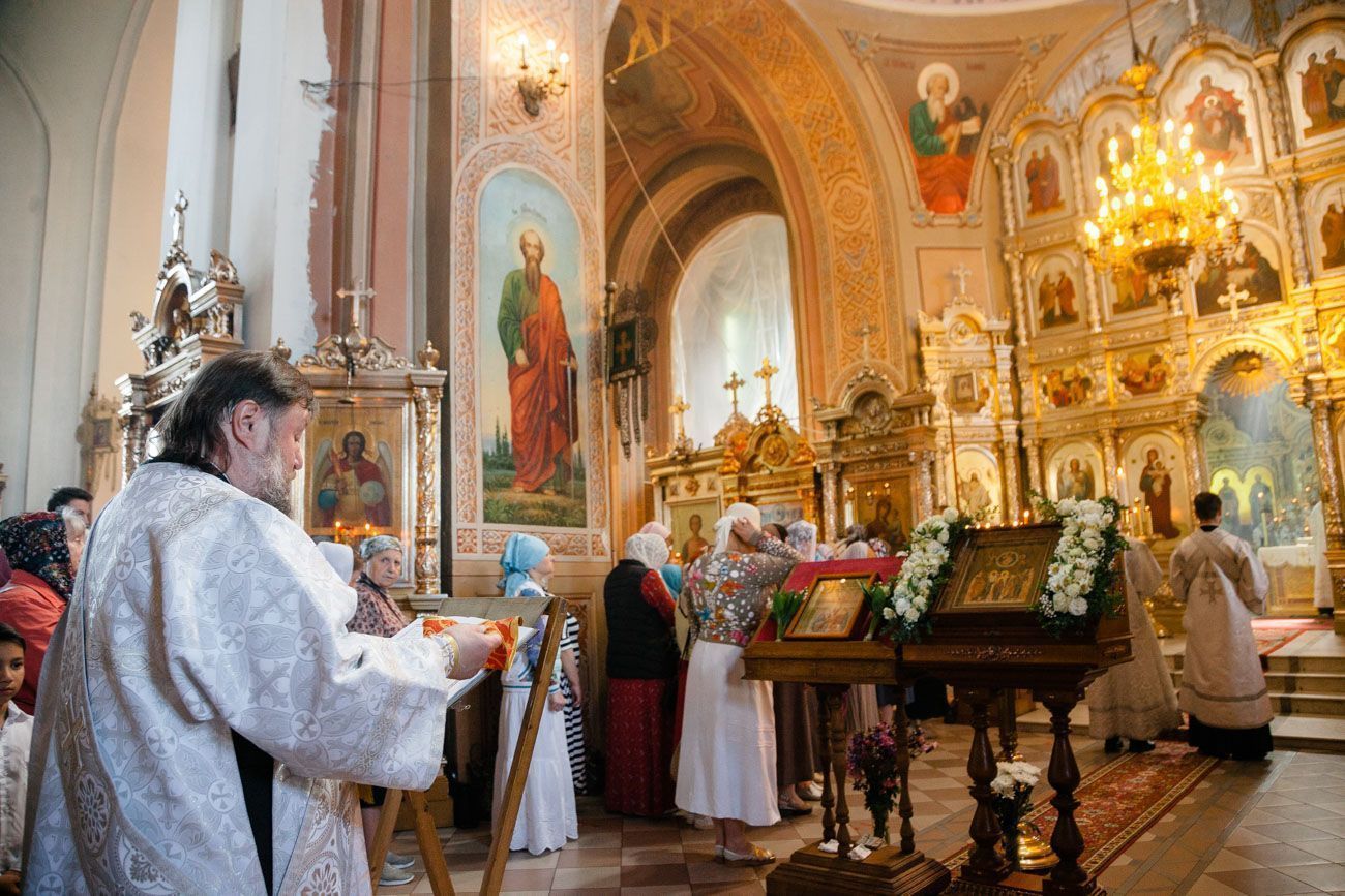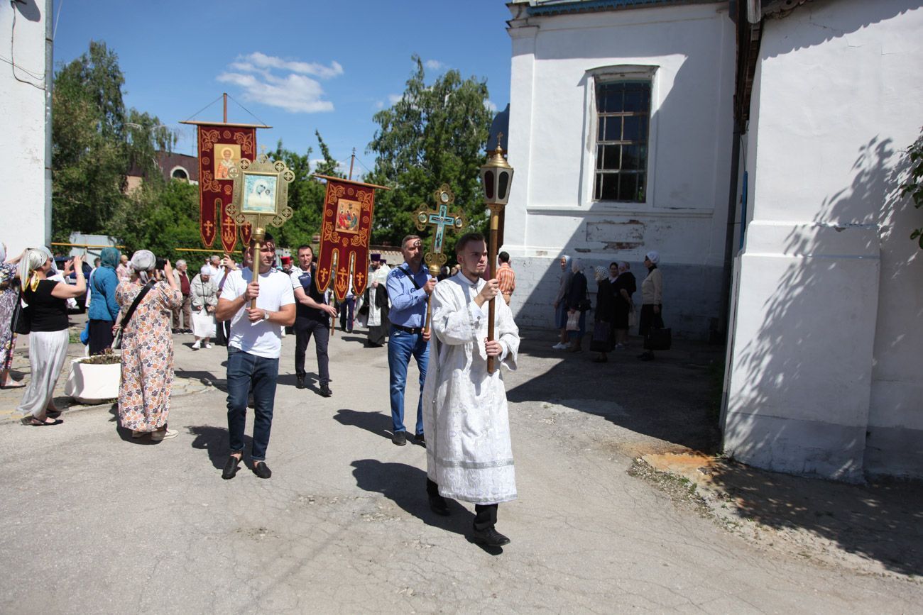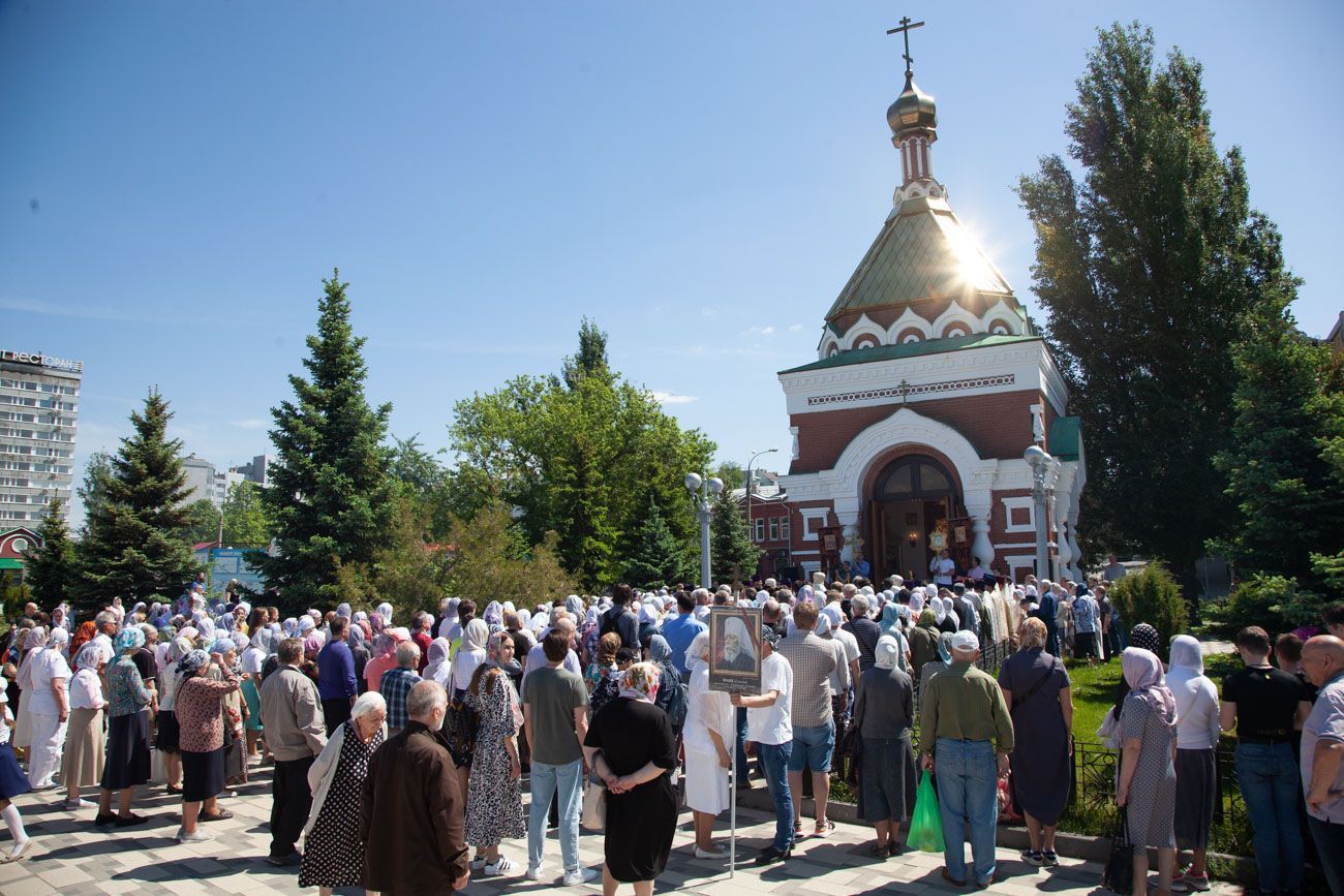К крестному ходу присоединяются все новые горожане, в том числе верующие Вознесенского собора. Крестный ход вступает на Алексиевскую набережную и растекается вокруг часовни. И сразу начинается водосвятный молебен.