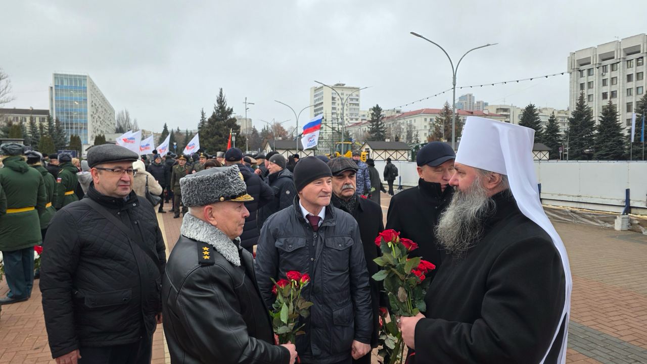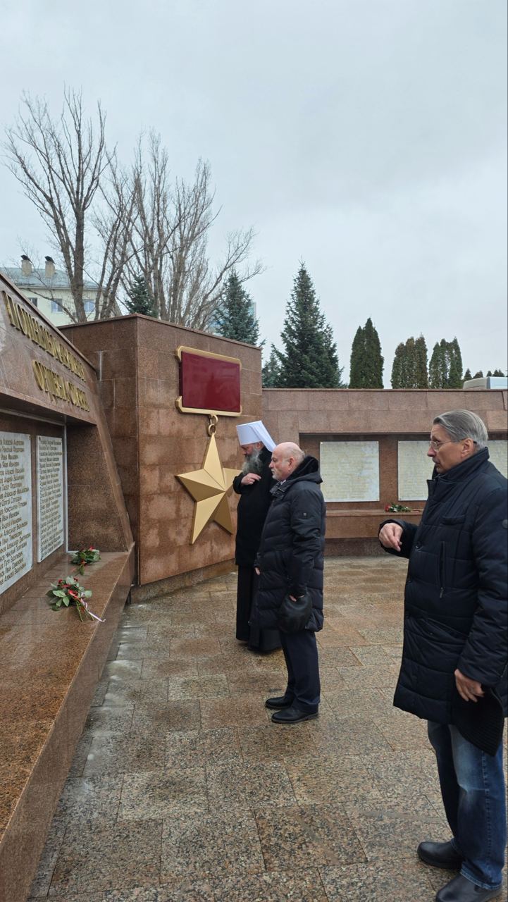 После богослужения прошла встреча с Героями Российской Федерации на территории храма. Затем участники мероприятия вместе с митрополитом Феодосием прошли по Аллее маршалов и возложили цветы к стеле «Куйбышевцы — Герои Советского Союза».