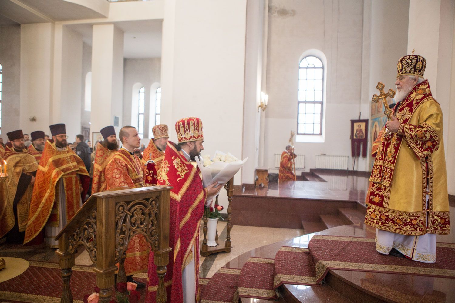 Настоятель собора протоиерей Владимир Загаринский преподнёс митрополиту Сергию букет цветов.