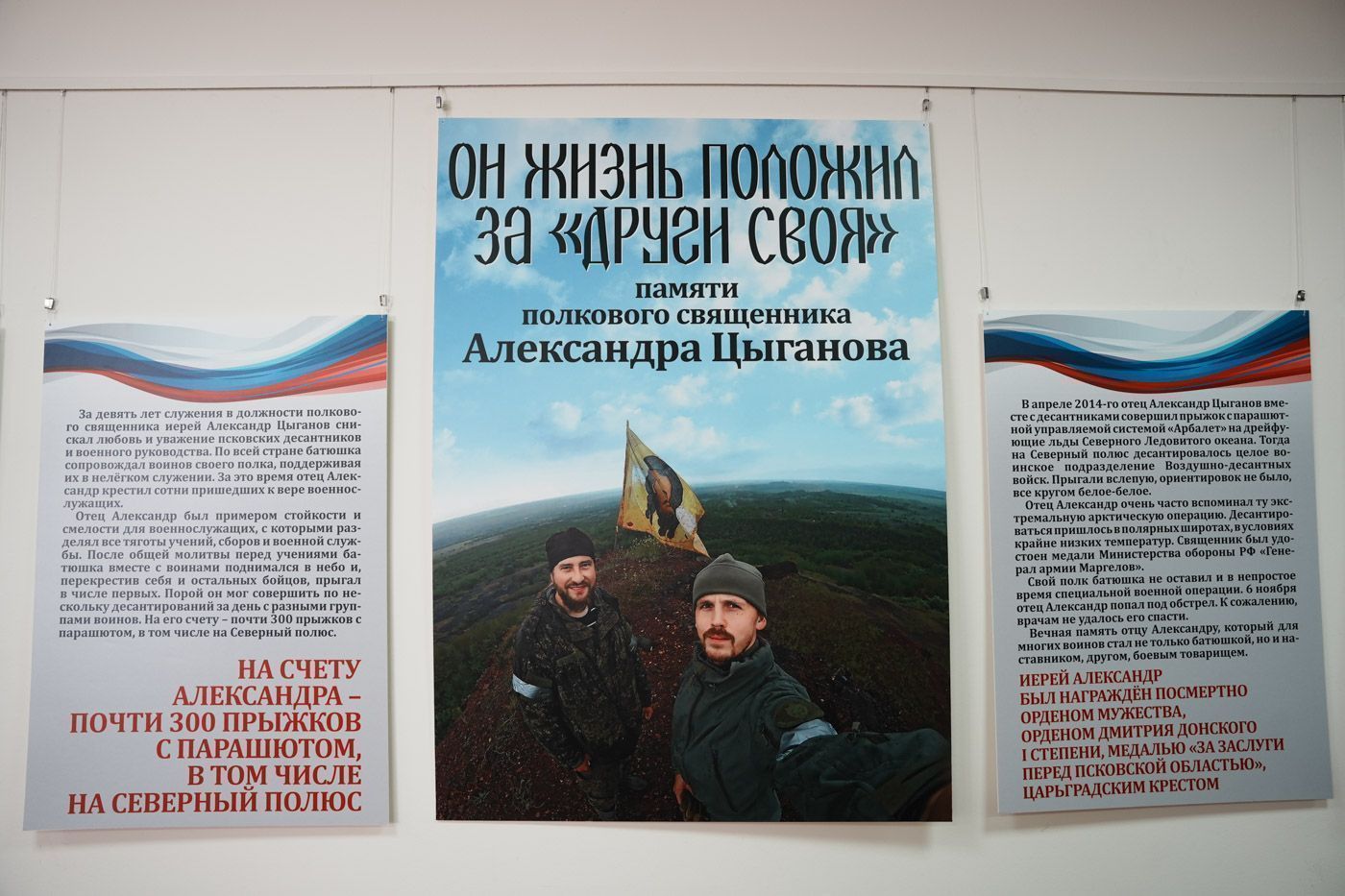 Справка: иерей Александр Цыганов (1987–2022) — выпускник Самарской духовной семинарии; клирик храма святого благоверного князя Александра Невского в Пскове; воинский священник 76-й десантно-штурмовой дивизии ВДВ. 21 ноября 2022 года скончался от тяжелых ранений, полученных при исполнении пастырского долга в зоне СВО. Посмертно удостоен ордена Мужества, ордена святого благоверного князя Димитрия Донского I степени, медали «За заслуги перед Псковской областью» и Царьградского креста. Известен многочисленными десантными учениями вместе с военнослужащими; на его счету почти 300 прыжков с парашютом, включая десантирование на дрейфующую льдину в районе Северного полюса.