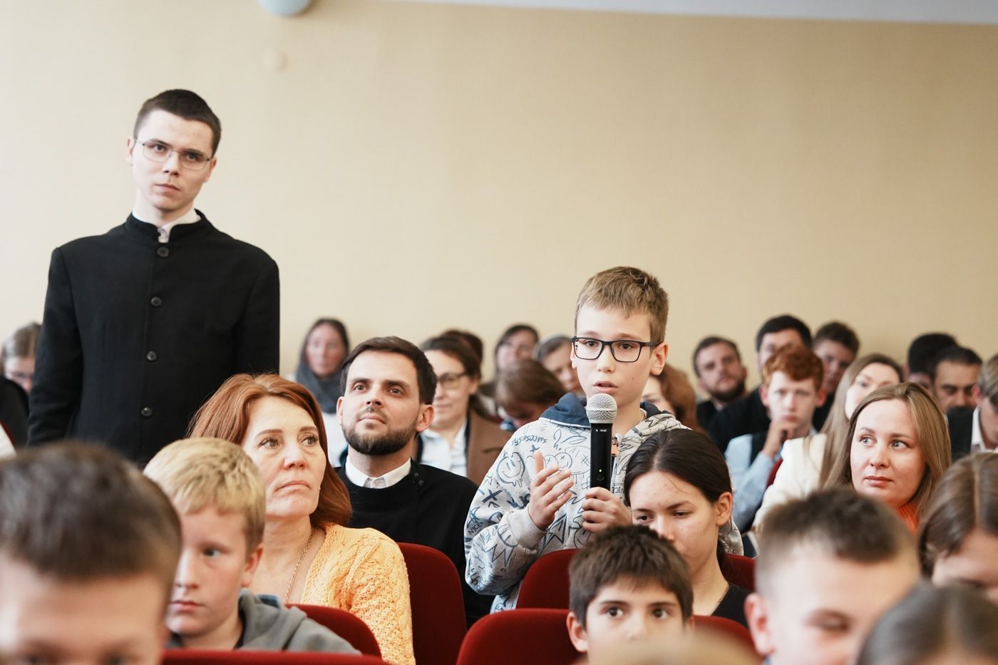 Атмосфера встречи была теплой и доверительной. Много вопросов прозвучало от школьников и студентов — о вере, свободе, ответственности, о месте человека Церкви в современном мире, о верности и дружбе, о честности, об опасностях медийного пространства. Каждый получил содержательный ответ и возможность высказаться.