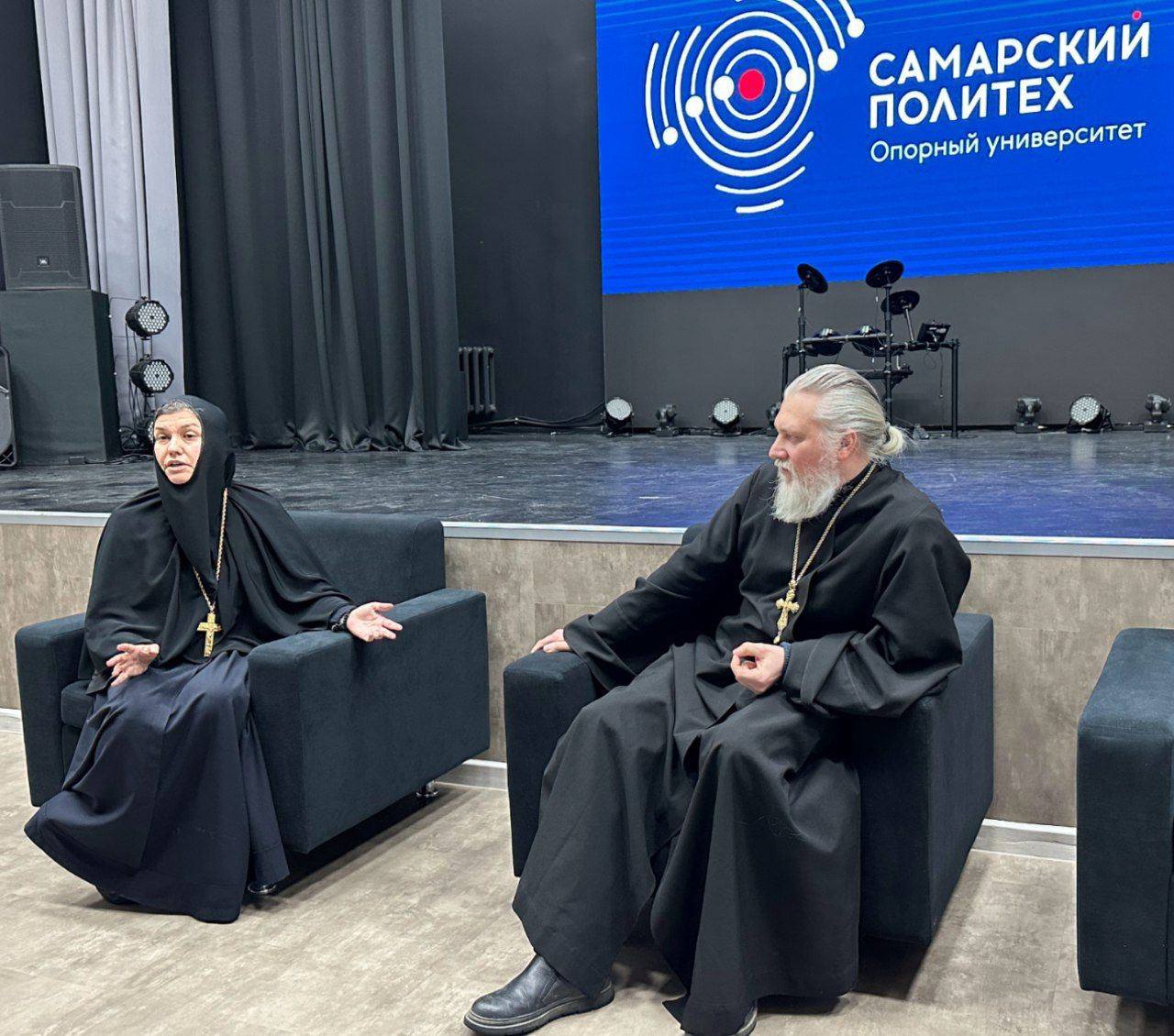 В диалоге с молодежью приняли участие руководитель миссионерского отдела Самарской епархии протоиерей Алексей Богдан и настоятельница Покровского Александро-Чагринского монастыря игумения Михаила (Солодухина).