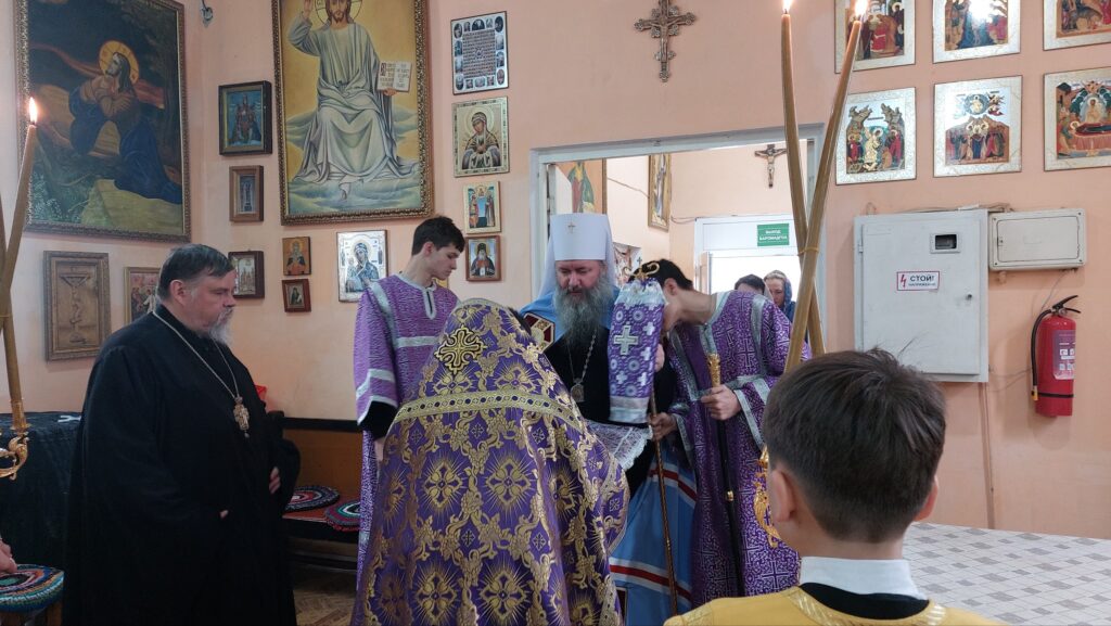 По отпусте было совершено славление Божией Матери и поклонение Кресту, после чего он, по традиции, был занесен в алтарь.