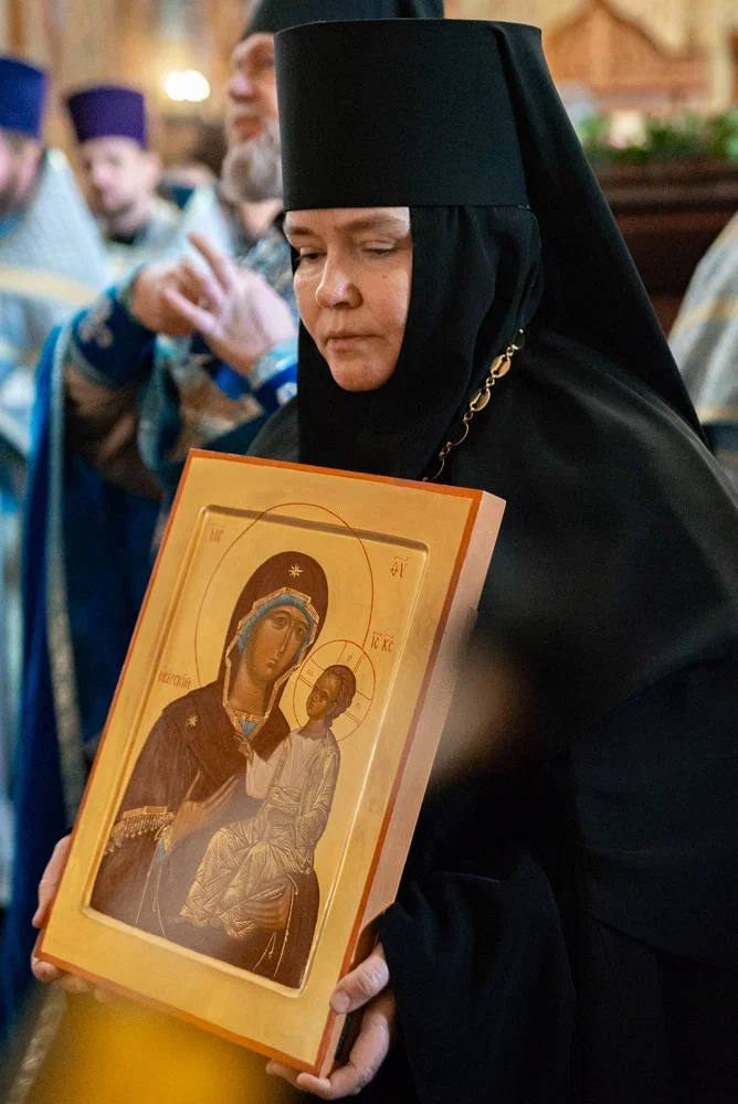После завершения торжественного богослужения настоятельница монастыря, Матушка Игумения, поздравила Митрополита Феодосия и преподнесла ему в дар Иверскую икону Божией Матери. Владыка Феодосий выразил благодарность Игумении Любови (Чусовой), тепло поздравил всех собравшихся с престольным праздником, а затем обратился к пастве с назидательной проповедью и преподал свое архипастырское благословение.