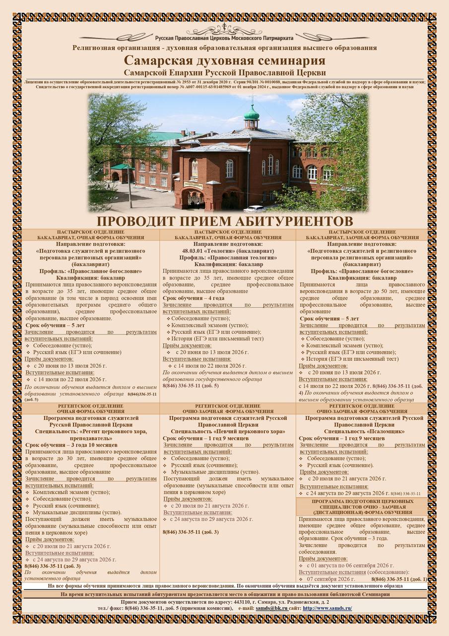 Самарская духовная семинария проводит набор абитуриентов